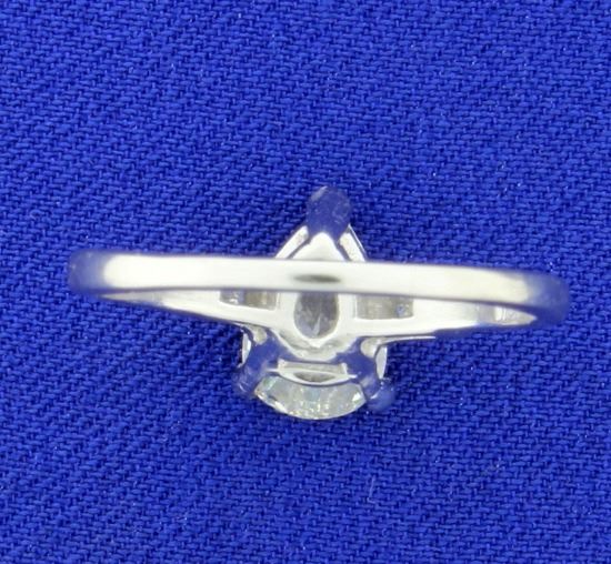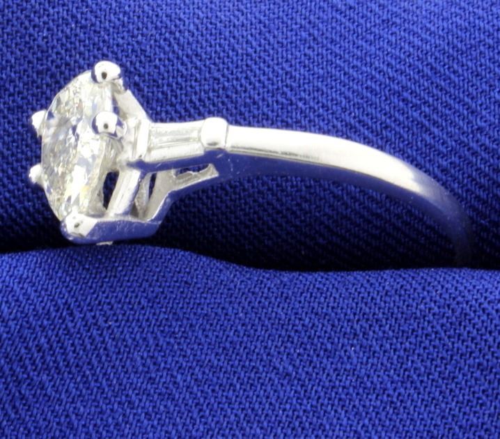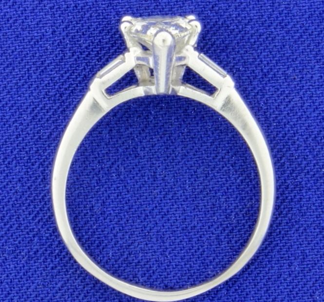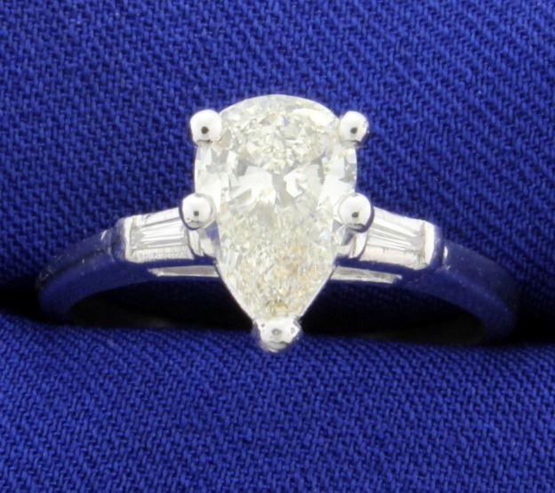 In platinum, the center pear shaped diamond is a 1.65ct SI clarity/M Color. The ring also contains two .1ct baguette diamonds in the shank that are SI clarity/I color. Size 9 1/2 5.2g