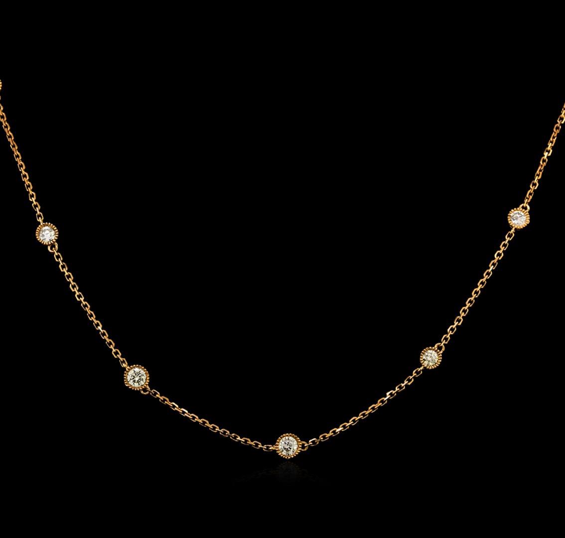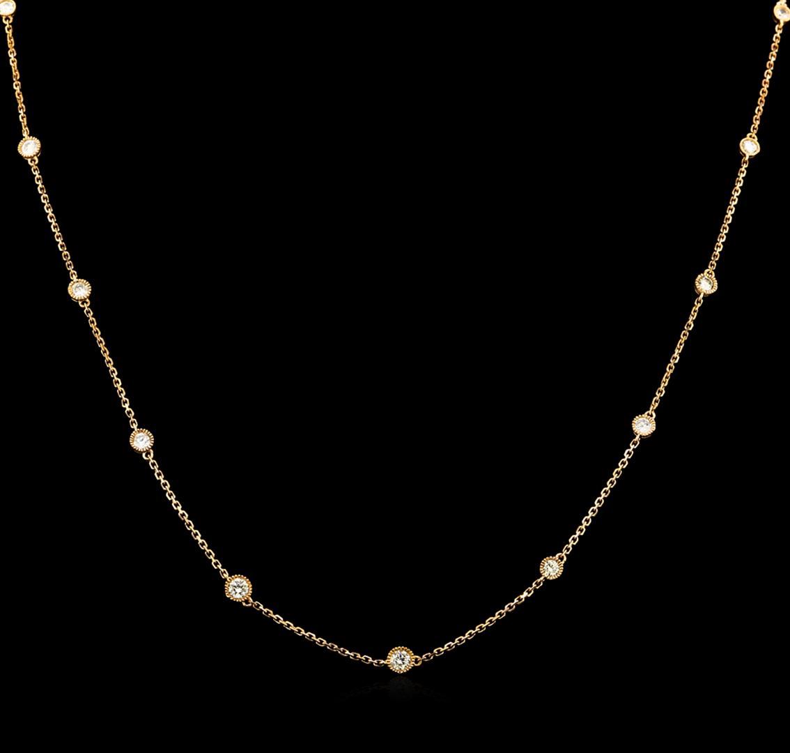 One electronically tested 18KT rose gold lady's combination cast & assembled diamonds by the yard necklace with a lobster claw clasp with a bright polish with milgrain detailing finish. Featured ladies' necklace has a 1.4 millimeter in width diamond cut cable link at 20 inches in length. Trademark is MICHA. Identified with markings of "18K 750". Condition is new, good workmanship. Containing: Sixteen bezel set round brilliant cut diamonds, measuring 3.20 - 3.10 x 1.95mm (depth est.) approximate total weight of 16 Stones = 1.85ct. Graded in the setting. Clarity: VS-2 to SI-1. Color: H - I. Cut Very Good. Total Weight of Diamonds 1.85ct. Total Weight of Necklace 6.20gm. GAS Appraised at $6,300.00.