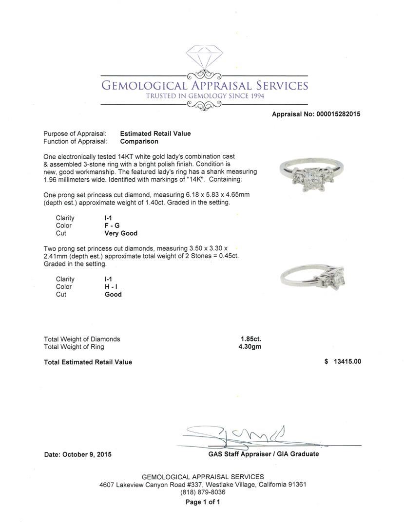 One electronically tested 14KT white gold lady's combination cast & assembled 3-stone ring with a bright polish finish. The featured lady's ring has a shank measuring 1.96 millimeters wide. Identified with markings of "14K". Condition is new, good workmanship. Containing: One prong set princess cut diamond, measuring 6.18 x 5.83 x 4.65mm (depth est.) approximate weight of 1.40ct. Graded in the setting. Clarity: I-1. Color: F - Very Good Two prong set princess cut diamonds, measuring 3.50 x 3.30 x 2.41mm (depth est.) approximate total weight of 2 Stones = 0.45ct. Graded in the setting. Clarity: I-1. Color: H - I. Cut Good. Total Weight of Diamonds 1.85ct. Total Weight of Ring 4.30gm. GAS Appraised at $13,415.00.