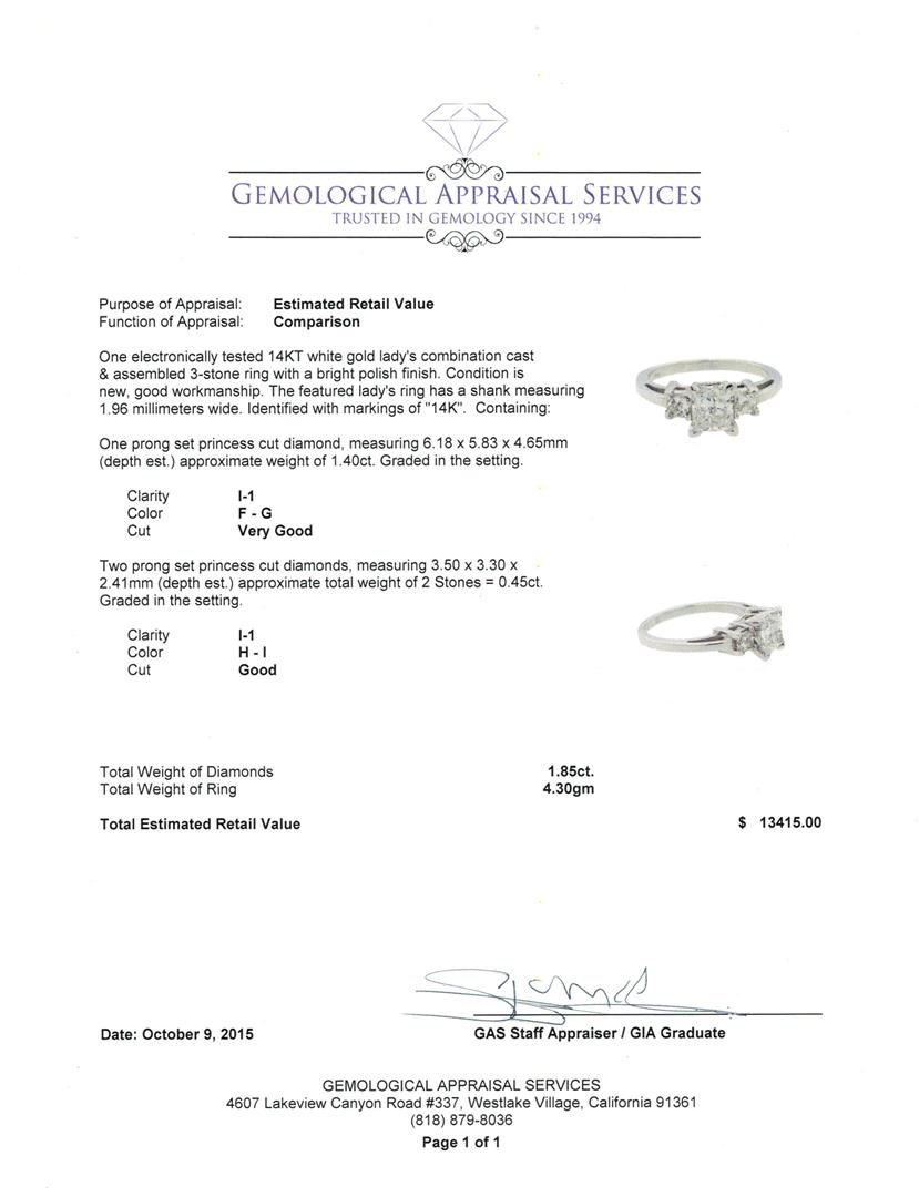 One electronically tested 14KT white gold lady's combination cast & assembled 3-stone ring with a bright polish finish. The featured lady's ring has a shank measuring 1.96 millimeters wide. Identified with markings of "14K". Condition is new, good workmanship. Containing: One prong set princess cut diamond, measuring 6.18 x 5.83 x 4.65mm (depth est.) approximate weight of 1.40ct. Graded in the setting. Clarity: I-1. Color: F - Very Good Two prong set princess cut diamonds, measuring 3.50 x 3.30 x 2.41mm (depth est.) approximate total weight of 2 Stones = 0.45ct. Graded in the setting. Clarity: I-1. Color: H - I. Cut Good. Total Weight of Diamonds 1.85ct. Total Weight of Ring 4.30gm. GAS Appraised at $13,415.00.
