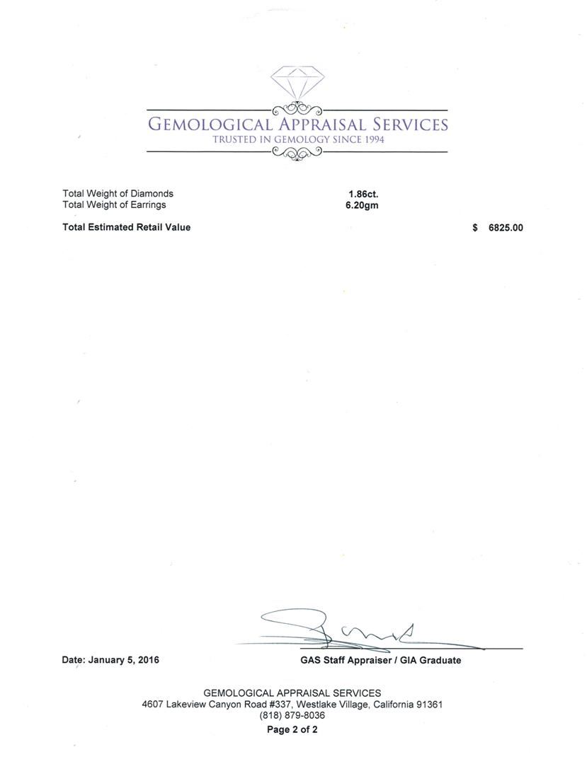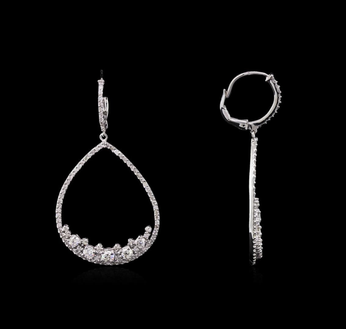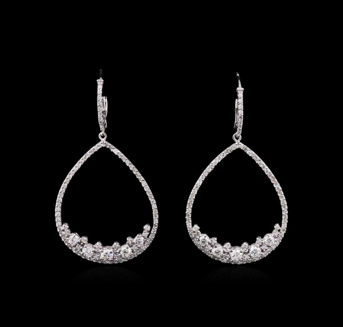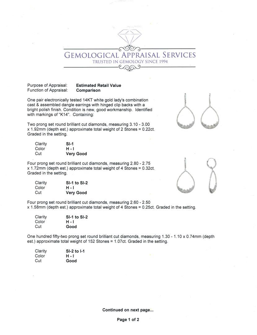 One pair electronically tested 14KT white gold lady's combination cast & assembled dangle earrings with hinged clip backs with a bright polish finish. Identified with markings of "K14". Condition is new, good workmanship. Containing: Two prong set round brilliant cut diamonds, measuring 3.10 - 3.00 x 1.92mm (depth est.) approximate total weight of 2 Stones = 0.22ct. Graded in the setting. Clarity: SI-1. Color: H - I. Cut Very Good Four prong set round brilliant cut diamonds, measuring 2.80 - 2.75 x 1.72mm (depth est.) approximate total weight of 4 Stones = 0.32ct. Graded in the setting. Clarity: SI-1 to SI-2. Color: H - I. Cut Very Good Four prong set round brilliant cut diamonds, measuring 2.60 - 2.50 x 1.58mm (depth est.) approximate total weight of 4 Stones = 0.25ct. Graded in the setting. Clarity: SI-1 to SI-2. Color: H - I. Cut Good One Hundred Fifty-Two prong set round brilliant cut diamonds, measuring 1.30 - 1.10 x 0.74mm (depth est.) approximate total weight of 152 Stones = 1.07ct. Graded in the setting. Clarity: SI-2 to I-1. Color: H - I. Cut Good. Total Weight of Diamonds 1.86ct. Total Weight of Earrings 6.20gm. GAS Appraised at $6,825.00.