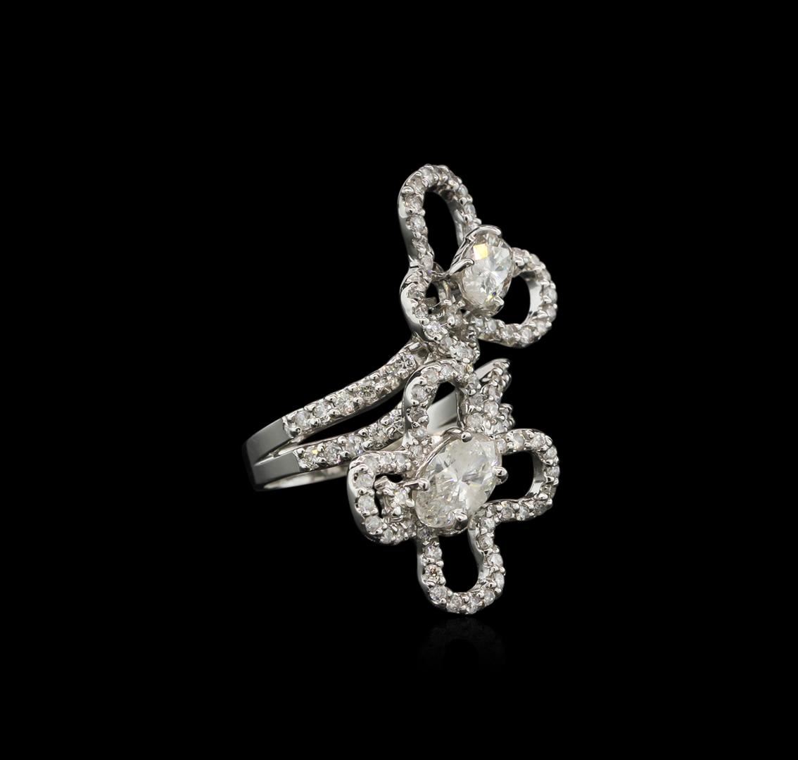 One electronically tested 14KT white gold ladies cast diamond ring with a bright polish finish. The ring features a stylized diamond set floral by-pass design supported by diamond set split shoulders, completed by a two and one-half millimeter wide band. Identified with markings of "K14". Condition is new, good workmanship. Containing: Two prong set oval shaped cut diamonds exact total weight 2 Stones = 1.10ct. Graded in the setting. Clarity: I-1. Color: I One Hundred Three prong set round brilliant cut diamonds exact total weight 103 Stones = 0.76ct. Graded in the setting. Clarity: SI-2 to I-1. Color: G - I. Total Weight of Diamonds 1.86ct. Total Weight of Ring 5.62gm. AIG Appraised at $7,670.00.