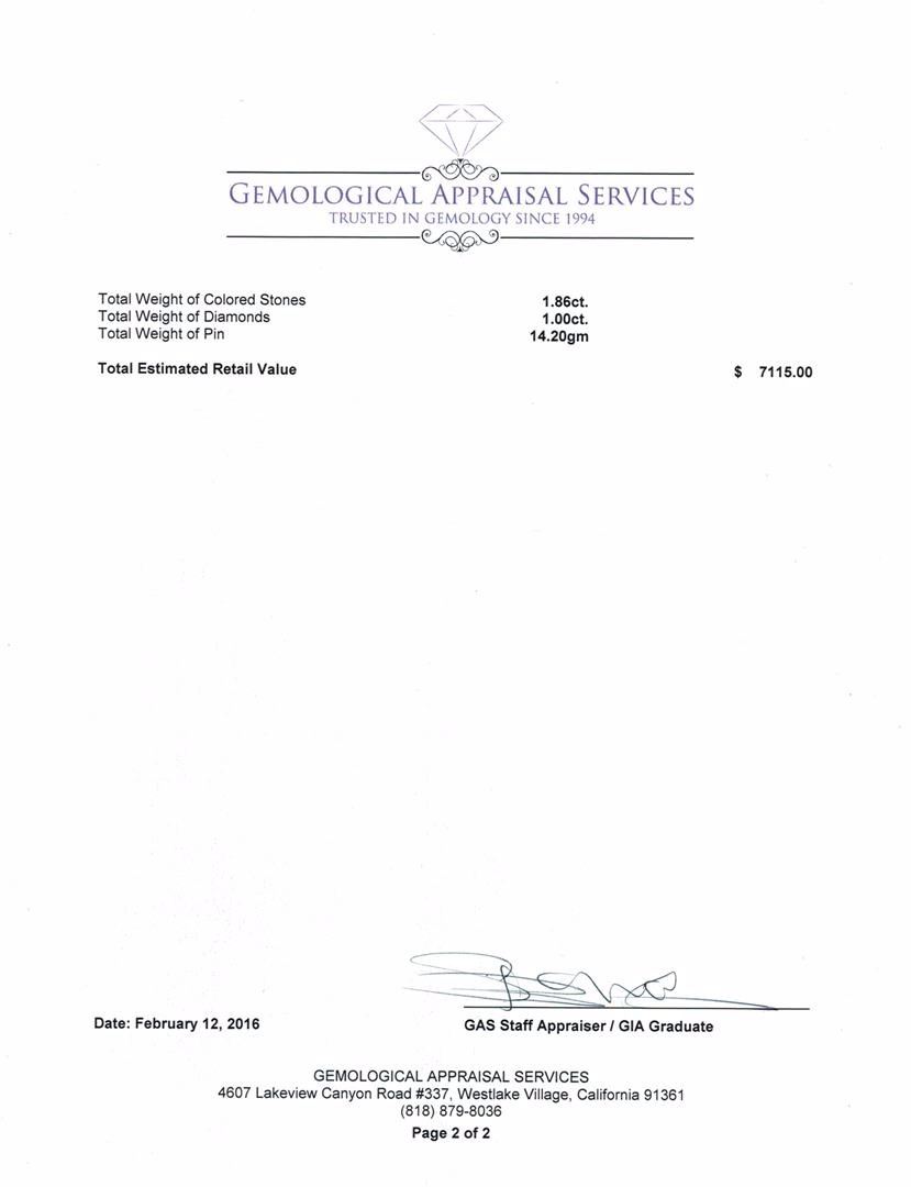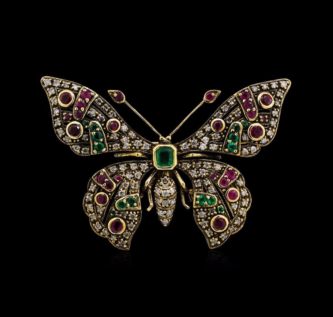One electronically tested 18KT yellow gold lady's combination cast & assembled fashion pin with a bright polish with milgrain detailing finish. Featured ladies pin has a Monarch butterfly motif. Identified with markings of "18K". Condition is used, good workmanship. Containing: One bezel set emerald standard step cut natural emerald, measuring 4.10 x 3.80 x 2.35mm, approximate weight of 0.30ct., clarity is moderately included, type III, medium light, moderately strong, very slightly bluish green color, (GIA vslbG 4/4), cut is good. Indications of oil residue. Transmitting light somewhat diffusely, transparent to translucent. Graded in the setting. Fourteen prong set emerald modified brilliant cut natural emeralds, measuring 2.00 x 1.50 x 0.95mm, approximate total weight of 0.28ct., clarity is slightly included, type III, medium, moderately strong, green color, (GIA G 5/4), cut is good. Indications of oil residue. Transmitting light with a minimum of distortion, transparent. Graded in the setting. Ten bezel set round modified brilliant cut natural rubies, measuring 2.50 - 2.10 x 1.50 mm, approximate total weight of 0.80ct., clarity is slightly included, type II, medium, moderately strong, red color, (GIA R 5/4), cut is very good. Colored gemstones are presumed to have been subjected to commonly used enhancement processes. Graded in the setting. Sixteen prong set round modified brilliant cut natural rubies, measuring 1.80 - 2.14 x 1.28 mm, approximate total weight of 0.48ct., clarity is slightly included, type II, medium, moderately strong, red color, (GIA R 5/4), cut is good. Colored gemstones are presumed to have been subjected to commonly used enhancement processes. Graded in the setting. One Hundred Six prong set round brilliant cut diamonds, measuring 1.40 - 1.30 x 0.85mm (depth est.) approximate total weight of 106 Stones = 1.00ct. Graded in the setting. Clarity: SI to I-1. Color: G - I. Cut Good. Total Weight of Colored Stones 1.86ct. Total Weight of Diamonds 1.00ct. Total Weight of Pin 14.20gm. GAS Appraised at $7,115.00.