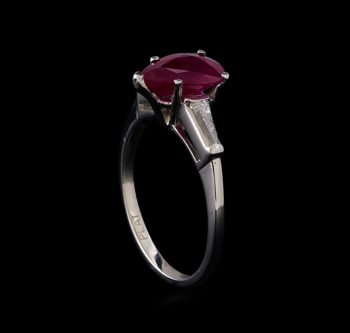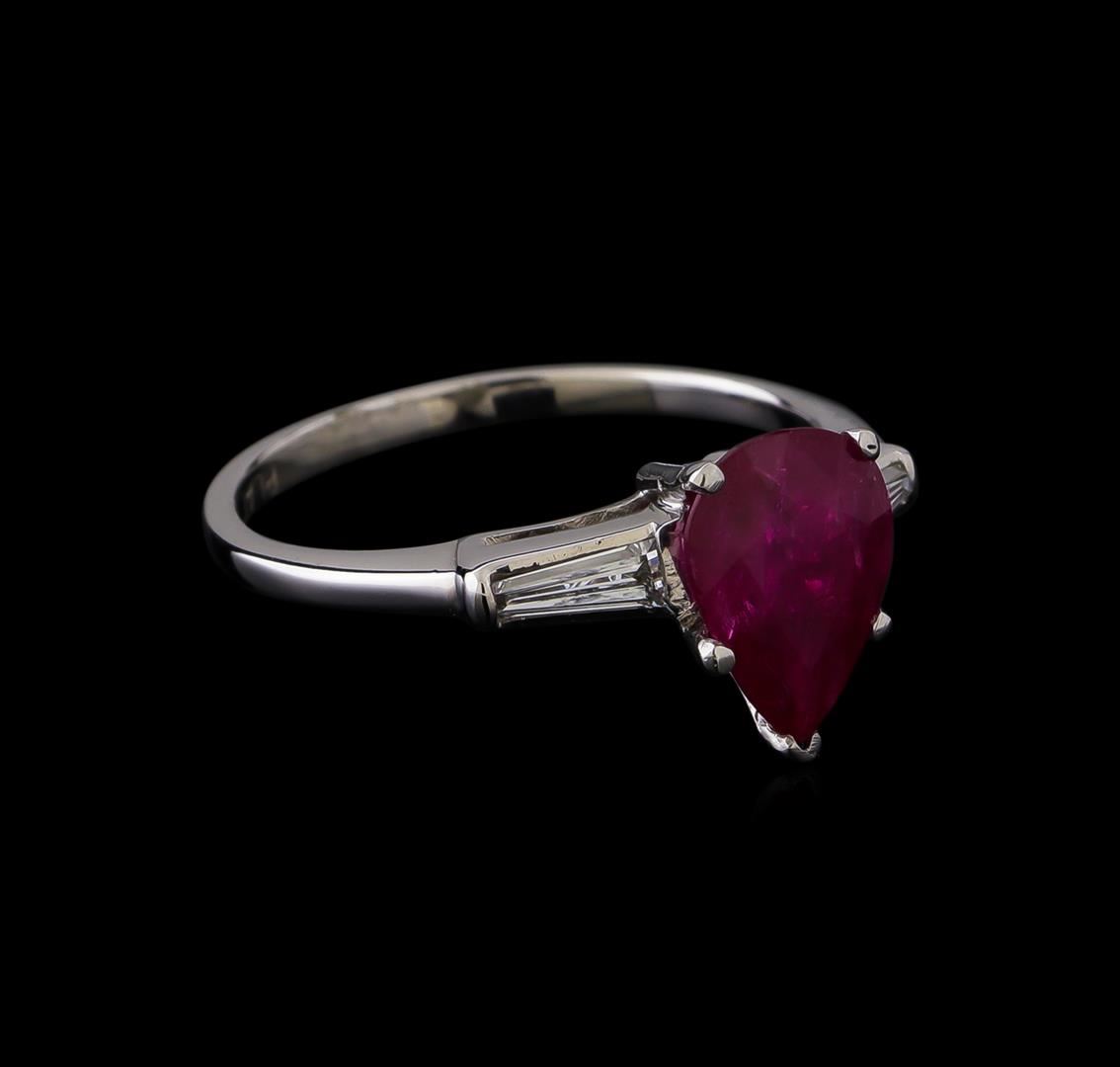 One platinum lady's ring weighing 4.00 grams containing: one pear shaped natural ruby with medium color weighing a total of 1.86 carats and two baguette cut natural diamonds with clarity VS-SI, color of G-H, fine cutting and proportions and a total weight of 0.20 carats. The total gemstone weight is 2.06 carats total weight. RBGS Appraised at $3,150.00.