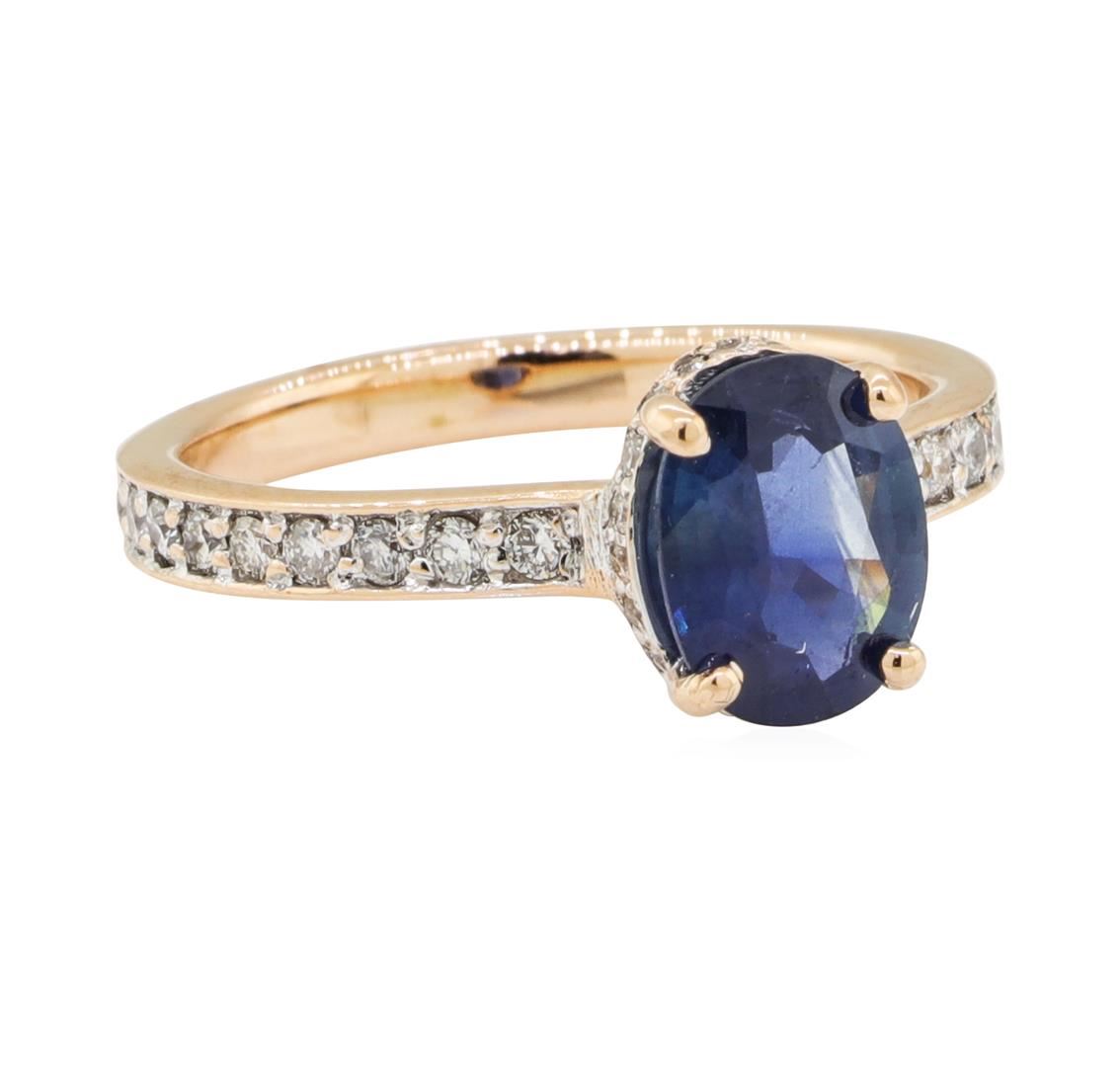 One electronically tested 18KT rose gold lady's cast fashion ring with a straight line with a bright polish finish. The featured lady's ring has diamond set crown setting for the center stone and a shank measuring 2.30 millimeters wide. Identified with markings of '18K'. Condition is new, good workmanship. Containing: One prong set oval modified mixed cut natural blue sapphire, measuring 8.03 x 6.15 x 3.25mm, (depth est.) approximate weight of 1.42ct., clarity is moderately included, medium, moderately strong, greenish blue color, (GIA gB 5/4), cut is good. Transmitting light somewhat diffusely, transparent to translucent. Colored gemstones are presumed to have been subjected to commonly used enhancement processes. Graded in the setting. Eighteen prong set round brilliant cut diamonds, measuring 1.80 - 1.70 x 1.08mm (depth est.) approximate total weight of 18 Stones = 0.36ct. Graded in the setting. Color H - I Clarity SI-1 to SI-2 Cut Good Eighteen prong set round brilliant cut diamonds, measuring 1.10 - 1.00 x 0.65mm (depth est.) approximate total weight of 18 Stones = 0.08ct. Graded in the setting. Color H - I Clarity SI-1 to SI-2 Cut Good. Total Weight of Colored Stones 1.42ct.. Total Weight of Diamonds 0.44ct.. Total Weight of Ring 3.00gm GAS Appraised at $2755.00. GAS Appraised at $2,755.00.
