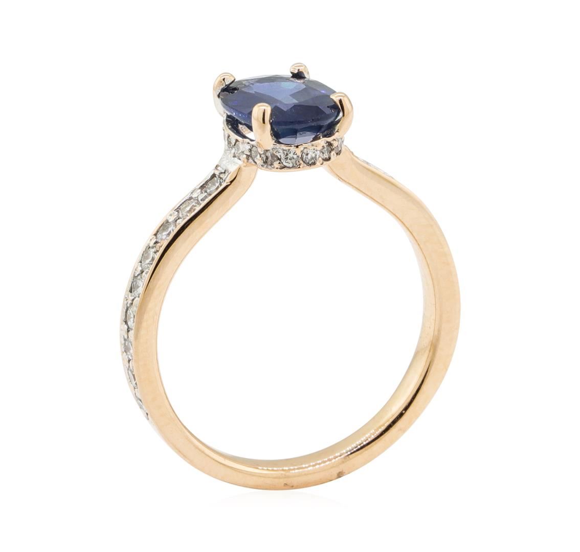 One electronically tested 18KT rose gold lady's cast fashion ring with a straight line with a bright polish finish. The featured lady's ring has diamond set crown setting for the center stone and a shank measuring 2.30 millimeters wide. Identified with markings of '18K'. Condition is new, good workmanship. Containing: One prong set oval modified mixed cut natural blue sapphire, measuring 8.03 x 6.15 x 3.25mm, (depth est.) approximate weight of 1.42ct., clarity is moderately included, medium, moderately strong, greenish blue color, (GIA gB 5/4), cut is good. Transmitting light somewhat diffusely, transparent to translucent. Colored gemstones are presumed to have been subjected to commonly used enhancement processes. Graded in the setting. Eighteen prong set round brilliant cut diamonds, measuring 1.80 - 1.70 x 1.08mm (depth est.) approximate total weight of 18 Stones = 0.36ct. Graded in the setting. Color H - I Clarity SI-1 to SI-2 Cut Good Eighteen prong set round brilliant cut diamonds, measuring 1.10 - 1.00 x 0.65mm (depth est.) approximate total weight of 18 Stones = 0.08ct. Graded in the setting. Color H - I Clarity SI-1 to SI-2 Cut Good. Total Weight of Colored Stones 1.42ct.. Total Weight of Diamonds 0.44ct.. Total Weight of Ring 3.00gm GAS Appraised at $2755.00. GAS Appraised.