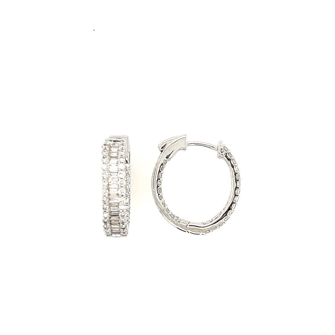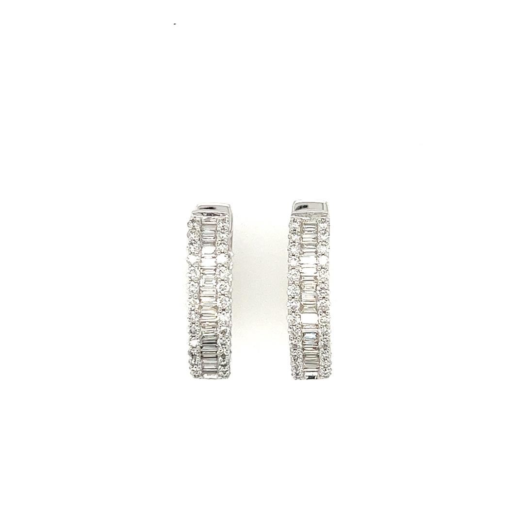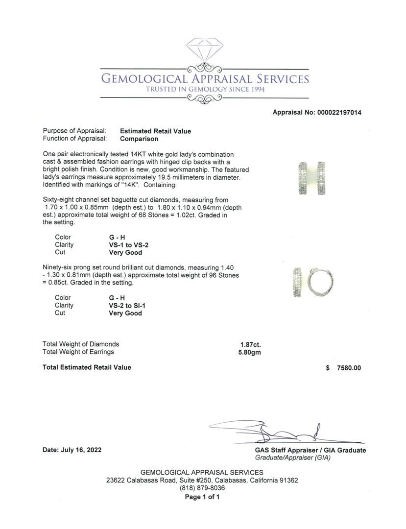 One pair electronically tested 14KT white gold lady's combination cast & assembled fashion earrings with hinged clip backs with a bright polish finish. Condition is new, good workmanship. The featured lady's earrings measure approximately 19.5 millimeters in diameter. Identified with markings of "14r. Containing: Sixty-eight channel set baguette cut diamonds, measuring from 1.70 x 1.00 x 0.85mm (depth est.) to 1.80 x 1.10 x 0.94mm (depth est.) approximate total weight of 68 Stones = 1.02ct. Graded in the setting. Color G - H Clarity VS-1 to VS-2 Cut Very Good Ninety-six prong set round brilliant cut diamonds, measuring 1.40 - 1.30 x 0.81mm (depth est.) approximate total weight of 96 Stones = 0.85ct. Graded in the setting. Color G - H Clarity VS-2 to SI-1 Cut Very Good Total Weight of Diamonds Total Weight of Earrings 5.80gm 1.87ct. Appraisal No: 000022197014 Total Estimated Retail Value $ 7580.00