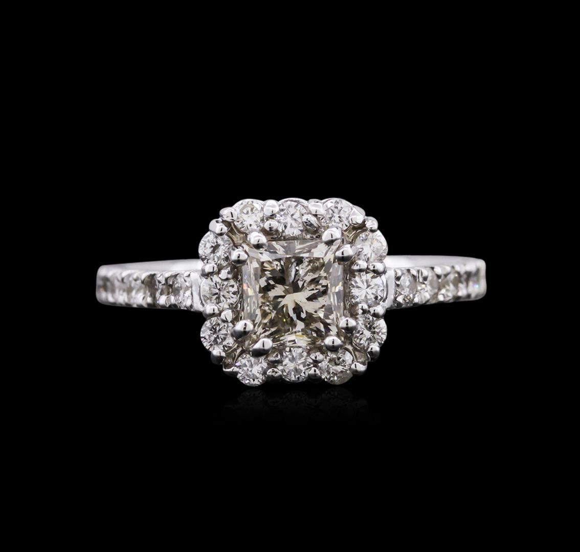 One electronically tested 14KT white gold ladies cast diamond engagement ring with a bright polish finish. Identified with markings of "14K". Condition is new. Containing: One prong set radiant shaped cut diamond, measuring 5.50 x 5.30 x 3.24mm (depth est.) approximate weight of 1.02ct. Clarity: I-1. Color: M, Cut is Good. Twenty-Two prong set round brilliant cut diamonds, measuring 2.00 - 1.50 x 1.05mm (depth est.) approximate total weight of 22 Stones = 0.85ct. Clarity: SI-1. Color: I - J, Cut is Good. Diamonds are graded in the mounting, unless otherwise stated. Total Weight of Diamonds 1.87ct. Total Weight of Engagement Ring 3.80 grams. GGL Appraised at $3,975.00.