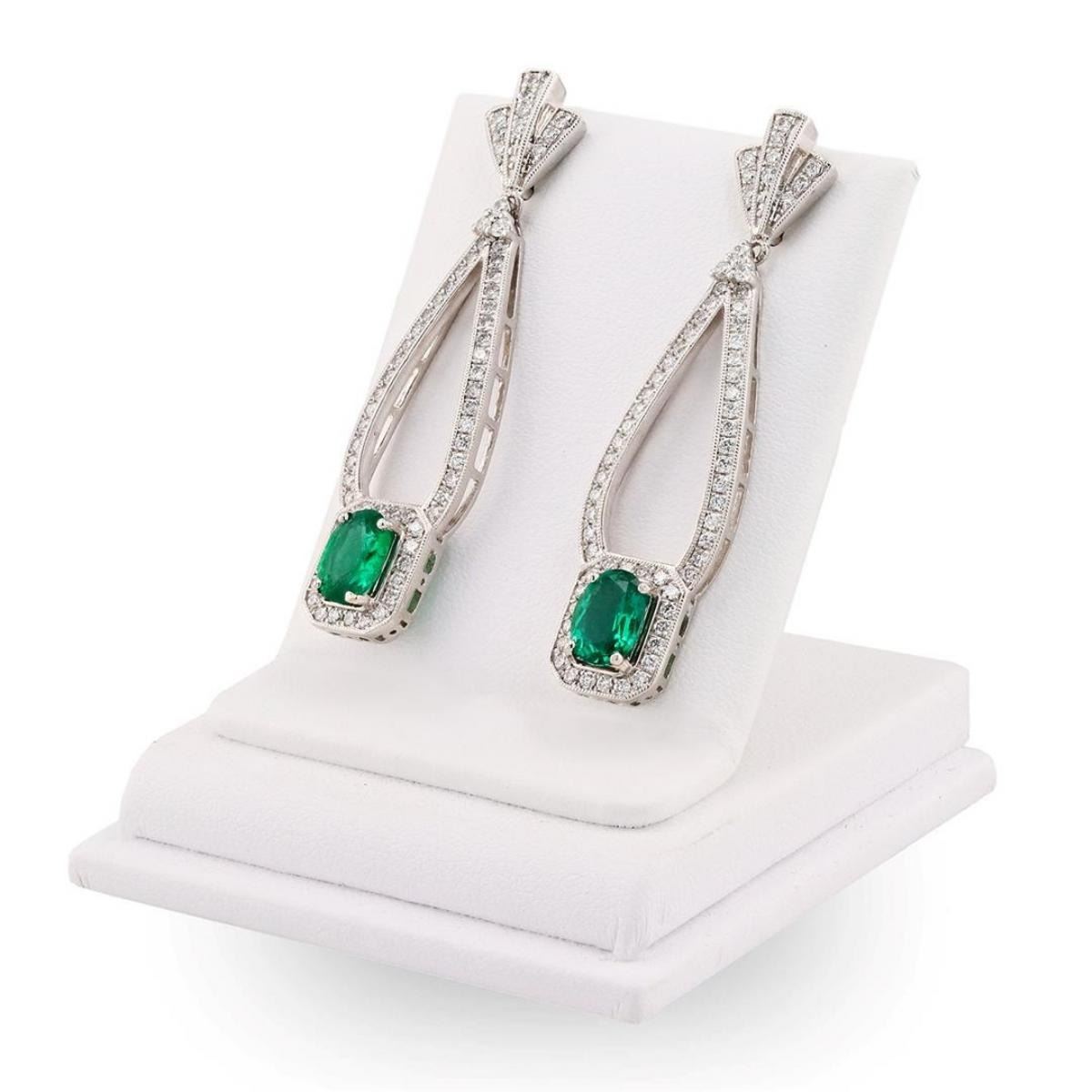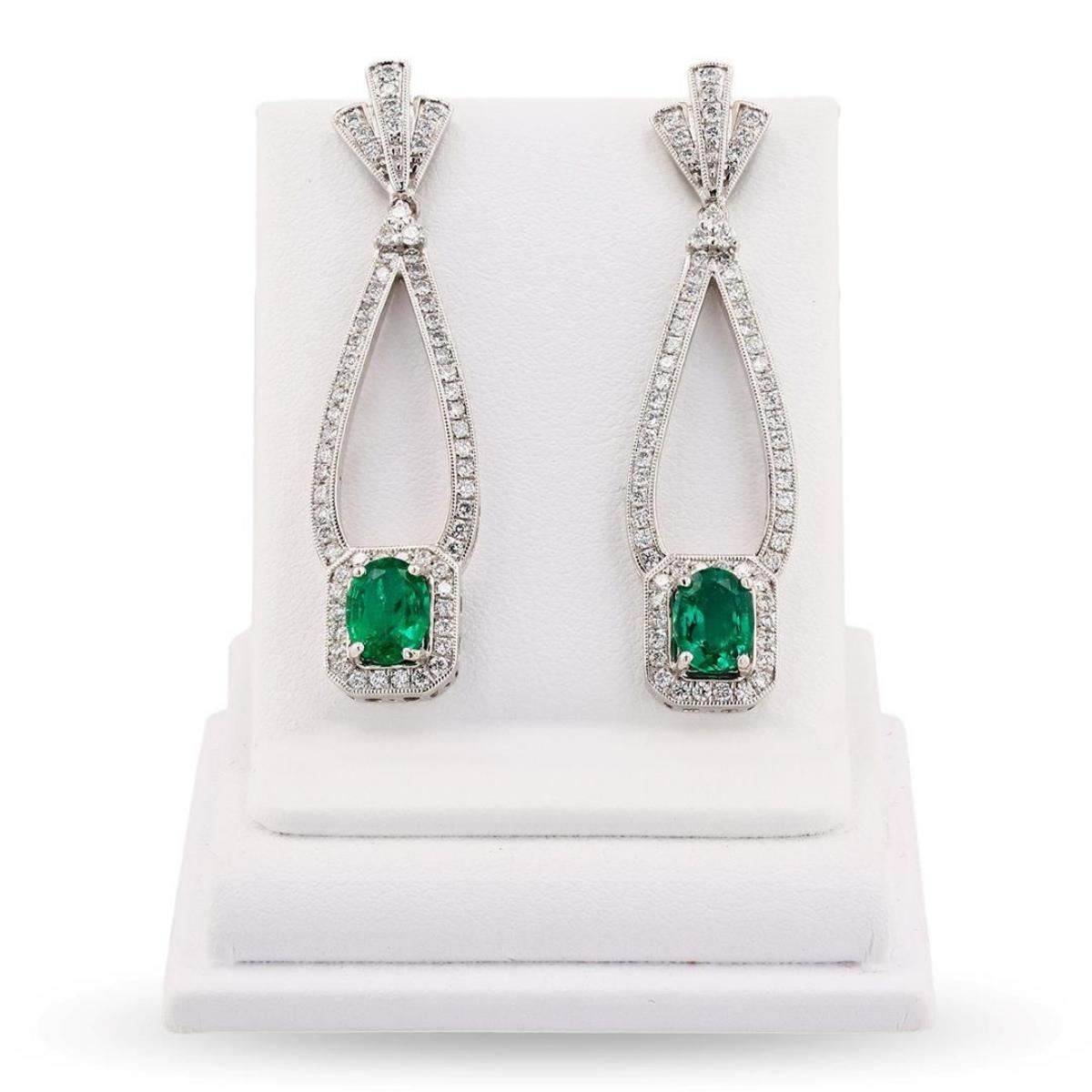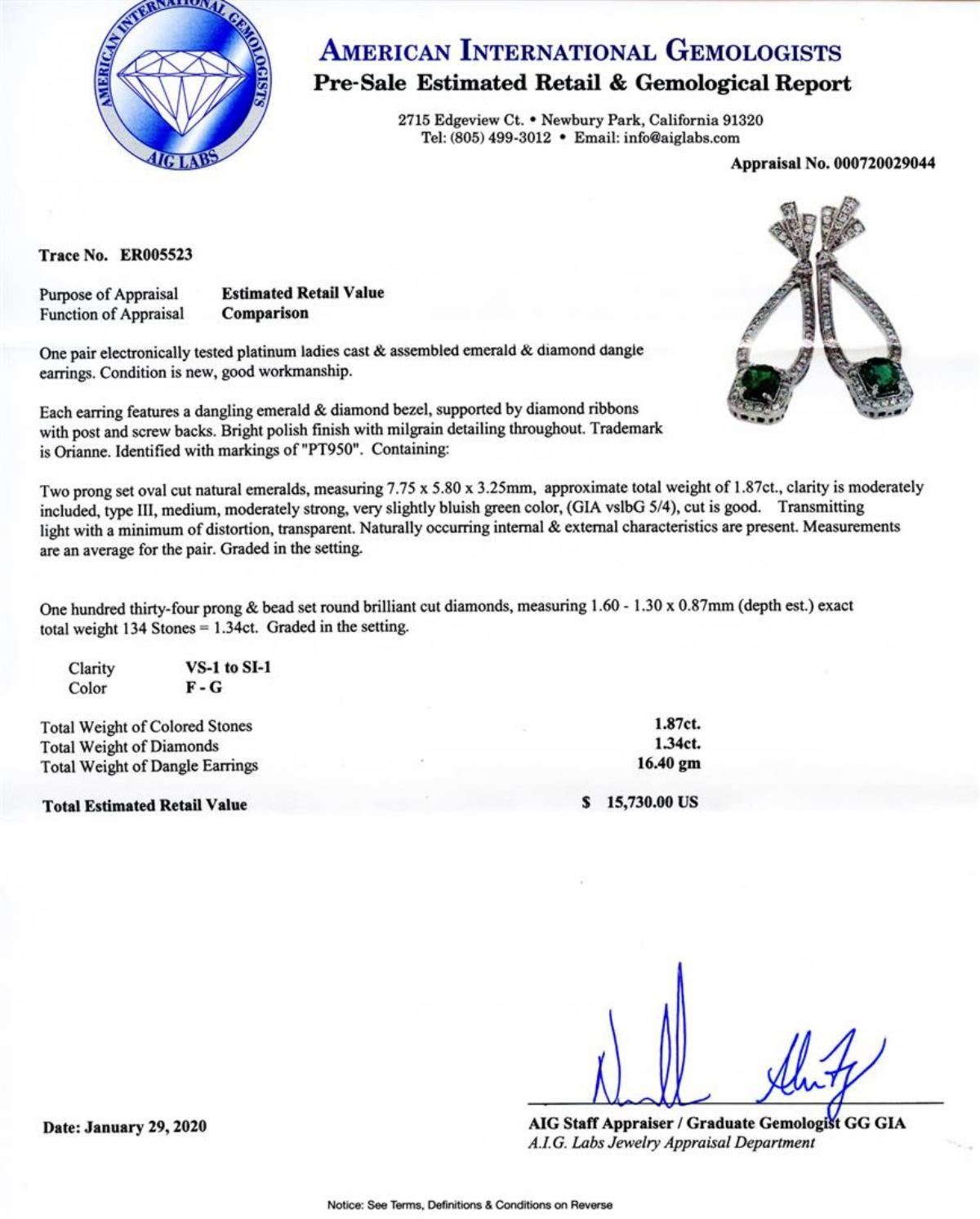 One pair electronically tested platinum ladies cast and assembled emerald and diamond dangle earrings. Condition is new, good workmanship. Each earring features a dangling emerald and diamond bezel, supported by diamond ribbons with post and screw backs. Bright polish finish with milgrain detailing throughout. Trademark is Orianne. Identified with markings of "PT950". Containing: Two prong set oval cut natural emeralds, measuring 7.75 x 5.80 x 3.25mm, approximate total weight of 1.87ct., clarity is moderately included, type III, medium, moderately strong, very slightly bluish green color, (GIA vslbG 5/4), cut is good. Transmitting light with a minimum of distortion, transparent. Naturally occurring internal and external characteristics are present. Measurements are an average for the pair. Graded in the setting. One hundred thirty-four prong and bead set round brilliant cut diamonds, measuring 1.60 - 1.30 x 0.87mm (depth est.) exact total weight 134 Stones = 1.34ct. Graded in the setting. Clarity VS-1 to SI-1 Color F-G Total Weight of Colored Stones 1.87ct. Total Weight of Diamonds 1.34ct. Total Weight of Dangle Earrings 16.40 gm