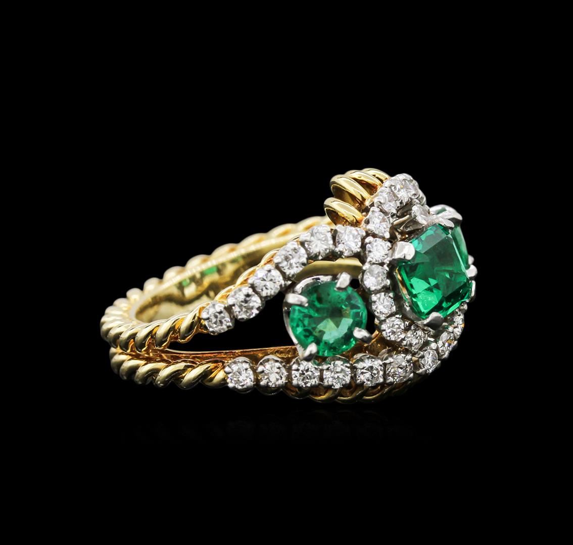 One electronically tested 18KT yellow gold lady's combination cast & assembled fashion ring with a split shank with a bright polish finish. The featured lady's ring has rope motif band and a shank measuring 4.03 millimeters wide. Identified with markings of "18K". Condition is new, good workmanship. Containing: One prong set emerald modified step cut natural emerald, measuring 5.60 x 5.50 x 3.49mm, 20% bulge factor, approximate weight of 0.99ct., clarity is slightly included, type III, dark, strong, very slightly bluish green color, (GIA vslbG 7/5), cut is very good. Transmitting light with a minimum of distortion, transparent. Colored gemstones are presumed to have been subjected to commonly used enhancement processes. Graded in the setting. Two prong set round modified brilliant cut natural emeralds, measuring 5.00 - 4.90 x 3.22 mm, approximate total weight of 0.88ct., clarity is moderately included, type III, medium, very slightly grayish, very slightly bluish green color, (GIA vslbG 5/3), cut is good. Transmitting light somewhat diffusely, semi-transparent to translucent. Naturally occurring internal & external characteristics are present. Colored gemstones are presumed to have been subjected to commonly used enhancement processes. Graded in the setting. Forty prong set round brilliant cut diamonds, measuring 1.90 - 1.80 x 1.20mm (depth est.) approximate total weight of 40 Stones = 1.00ct. Graded in the setting. Clarity: VS-2 to SI-1. Color: G - Good. Total Weight of Colored Stones 1.87ct. Total Weight of Diamonds 1.00ct. Total Weight of Ring 10.60gm. GAS Appraised at $14,035.00.