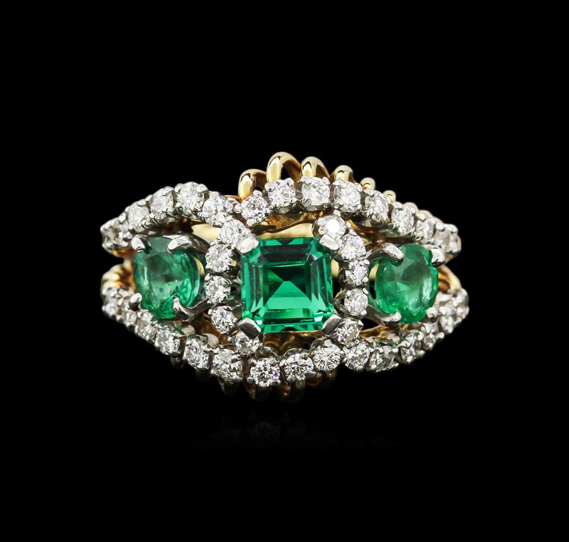 One electronically tested 18KT yellow gold lady's combination cast & assembled fashion ring with a split shank with a bright polish finish. The featured lady's ring has rope motif band and a shank measuring 4.03 millimeters wide. Identified with markings of "18K". Condition is new, good workmanship. Containing: One prong set emerald modified step cut natural emerald, measuring 5.60 x 5.50 x 3.49mm, 20% bulge factor, approximate weight of 0.99ct., clarity is slightly included, type III, dark, strong, very slightly bluish green color, (GIA vslbG 7/5), cut is very good. Transmitting light with a minimum of distortion, transparent. Colored gemstones are presumed to have been subjected to commonly used enhancement processes. Graded in the setting. Two prong set round modified brilliant cut natural emeralds, measuring 5.00 - 4.90 x 3.22 mm, approximate total weight of 0.88ct., clarity is moderately included, type III, medium, very slightly grayish, very slightly bluish green color, (GIA vslbG 5/3), cut is good. Transmitting light somewhat diffusely, semi-transparent to translucent. Naturally occurring internal & external characteristics are present. Colored gemstones are presumed to have been subjected to commonly used enhancement processes. Graded in the setting. Forty prong set round brilliant cut diamonds, measuring 1.90 - 1.80 x 1.20mm (depth est.) approximate total weight of 40 Stones = 1.00ct. Graded in the setting. Clarity: VS-2 to SI-1. Color: G - Good. Total Weight of Colored Stones 1.87ct. Total Weight of Diamonds 1.00ct. Total Weight of Ring 10.60gm. GAS Appraised at $14,035.00.