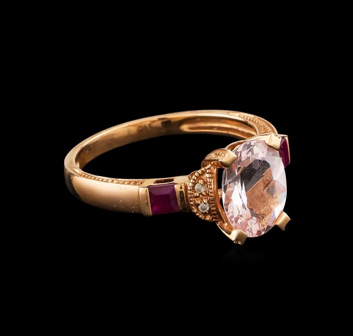 One electronically tested 14KT rose gold ladies cast colored gemstone and diamond ring. The featured morganite is set between mirroring diamond duos supported by laboratory created ruby set shoulders, completed by a two millimeter wide band. Bright and patterned finish. Identified with markings of "14K". Condition is new, good workmanship. Containing: One prong set oval mixed cut natural morganite, measuring 9.80 x 7.60 x 4.40mm, approximate weight of 1.87ct., clarity is eye clean, type I, light, very slightly brownish, orangy red color, (GIA oR 3/3), cut is good. Transmitting light with no distortion, transparent. Graded in the setting. Two channel set square step cut laboratory created rubies, measuring 3.00 x 3.00 x 2.00mm, approximate total weight of 0.36ct., clarity is moderately included, type II, medium dark, moderately strong, slightly purplish red color, (GIA slpR 6/4), cut is good. Transmitting light somewhat diffusely, transparent to translucent. Laboratory created internal & external characteristics are present. Color grade is an average for the pair. Graded in the setting. Four prong set round brilliant cut diamonds, measuring 1.10 - 1.00 x 0.63mm (depth est.) approximate total weight of 4 Stones = 0.02ct. Graded in the setting. Clarity: I-2. Color: G - I. Total Weight of Colored Stones 2.23ct. Total Weight of Diamonds 0.02ct. Total Weight of Ring 3.00gm. AIG Appraised at $1,210.00.