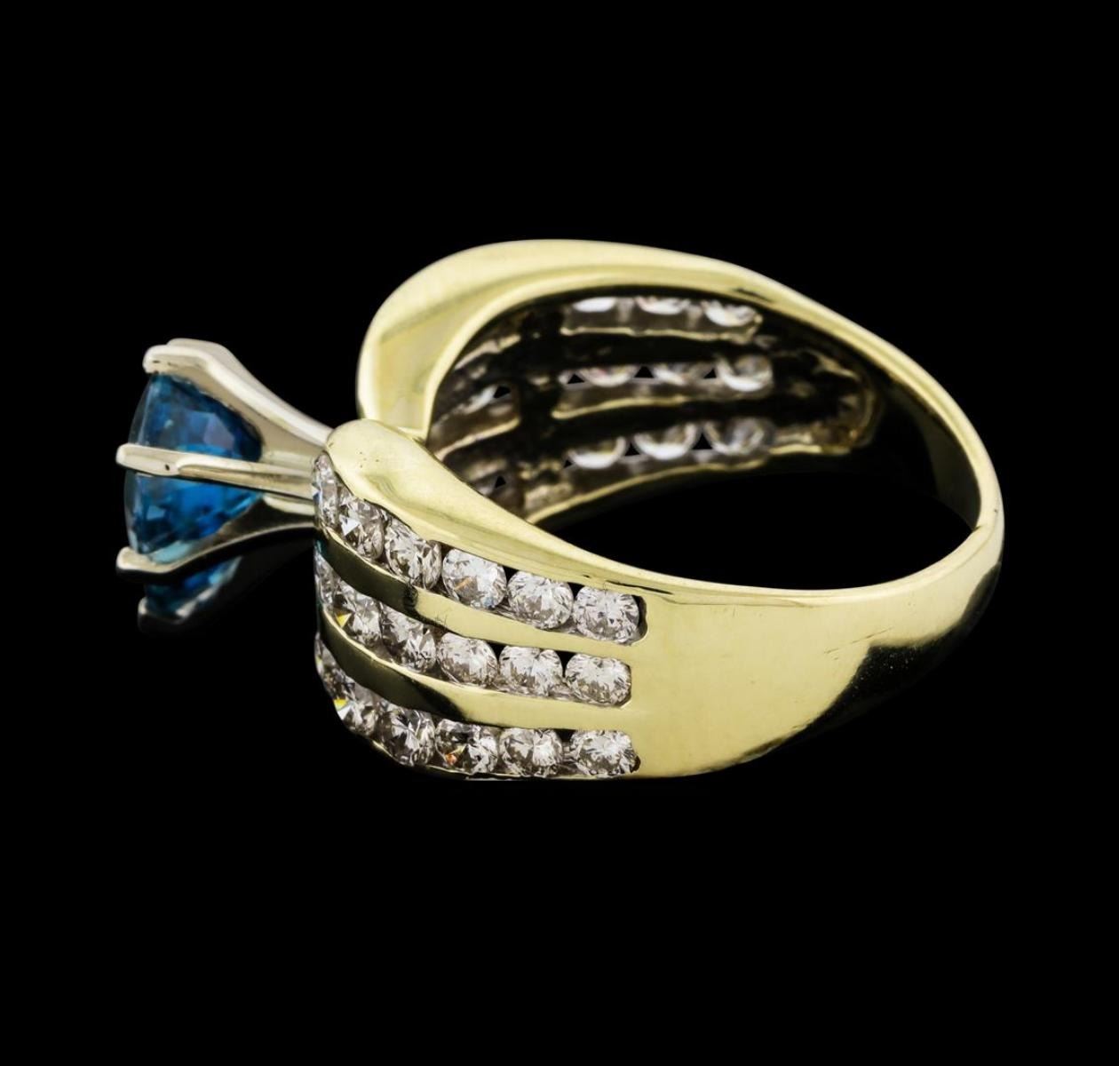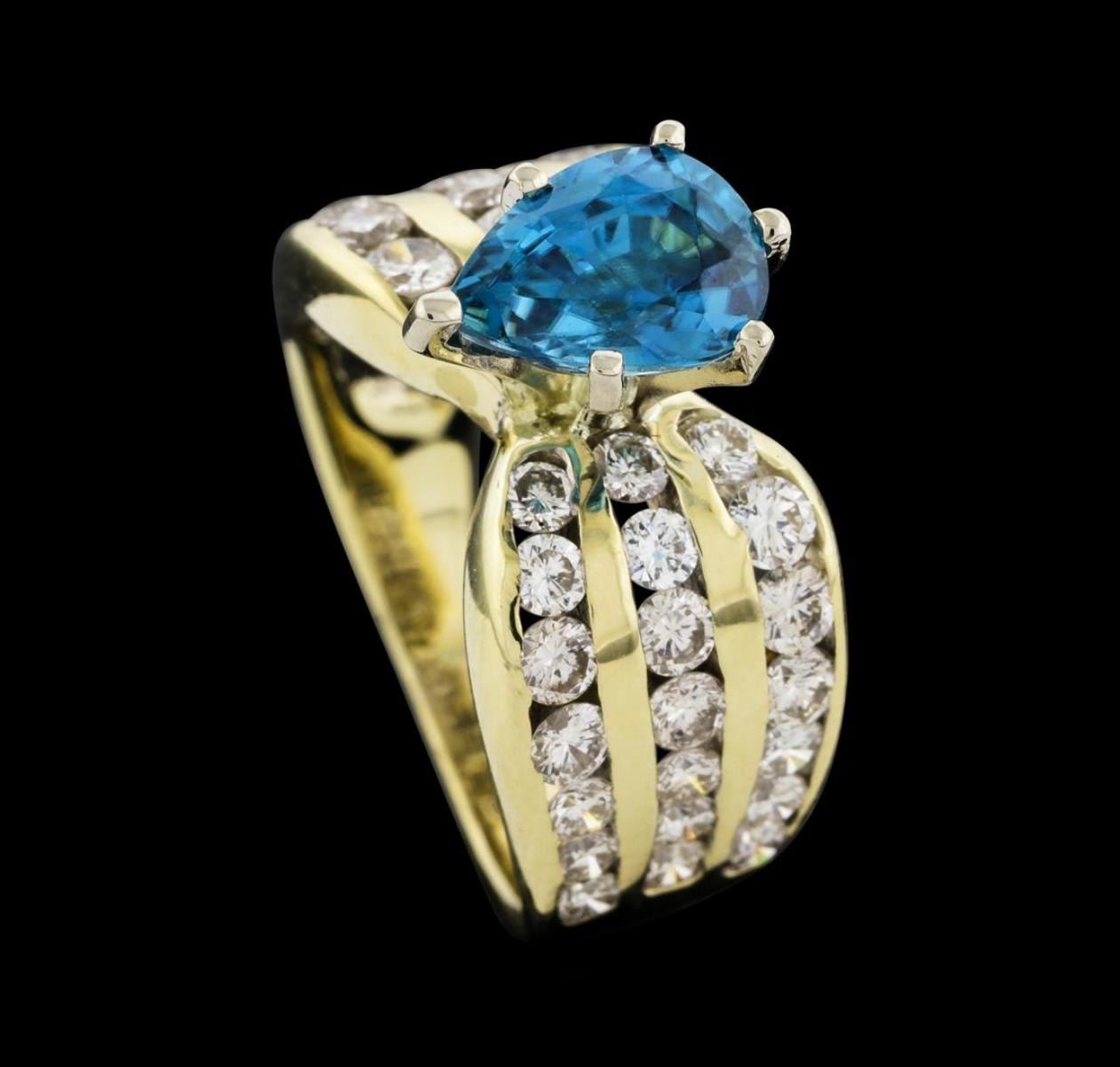 One Ring : 14KT yellow gold with a total weight of 5.25gm featuring blue topaz weighing 1.87ct and diamonds weighing 1.50ctw.