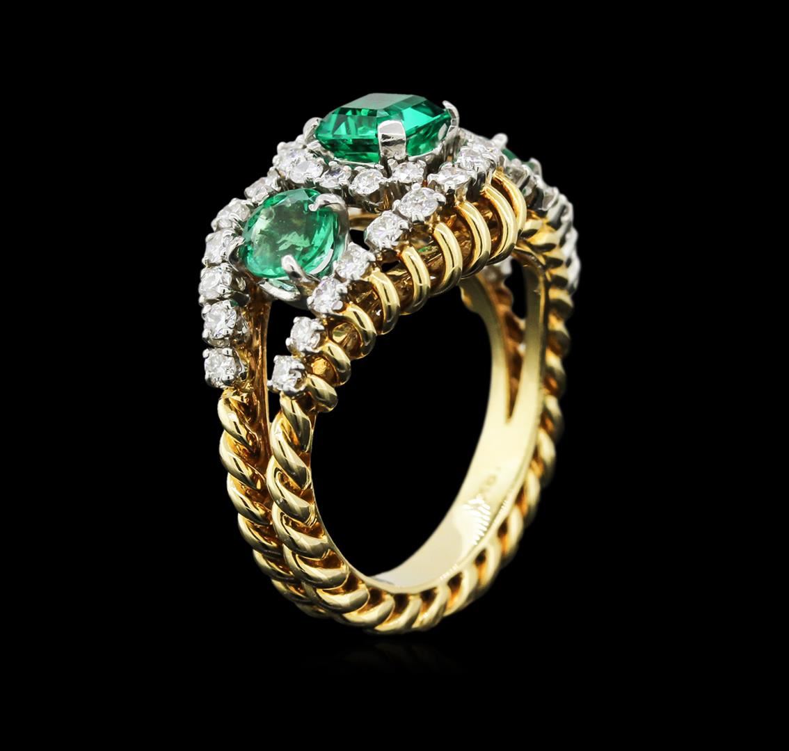 One electronically tested 18KT yellow gold lady's combination cast & assembled fashion ring with a split shank with a bright polish finish. The featured lady's ring has rope motif band and a shank measuring 4.03 millimeters wide. Identified with markings of "18K". Condition is new, good workmanship. Containing: One prong set emerald modified step cut natural emerald, measuring 5.60 x 5.50 x 3.49mm, 20% bulge factor, approximate weight of 0.99ct., clarity is slightly included, type III, dark, strong, very slightly bluish green color, (GIA vslbG 7/5), cut is very good. Transmitting light with a minimum of distortion, transparent. Colored gemstones are presumed to have been subjected to commonly used enhancement processes. Graded in the setting. Two prong set round modified brilliant cut natural emeralds, measuring 5.00 - 4.90 x 3.22 mm, approximate total weight of 0.88ct., clarity is moderately included, type III, medium, very slightly grayish, very slightly bluish green color, (GIA vslbG 5/3), cut is good. Transmitting light somewhat diffusely, semi-transparent to translucent. Naturally occurring internal & external characteristics are present. Colored gemstones are presumed to have been subjected to commonly used enhancement processes. Graded in the setting. Forty prong set round brilliant cut diamonds, measuring 1.90 - 1.80 x 1.20mm (depth est.) approximate total weight of 40 Stones = 1.00ct. Graded in the setting. Clarity: VS-2 to SI-1. Color: G - Good. Total Weight of Colored Stones 1.87ct. Total Weight of Diamonds 1.00ct. Total Weight of Ring 10.60gm. GAS Appraised at $14,035.00.
