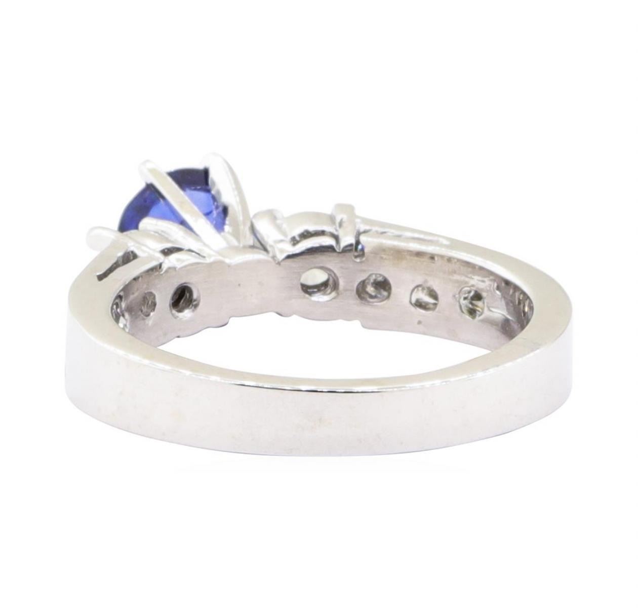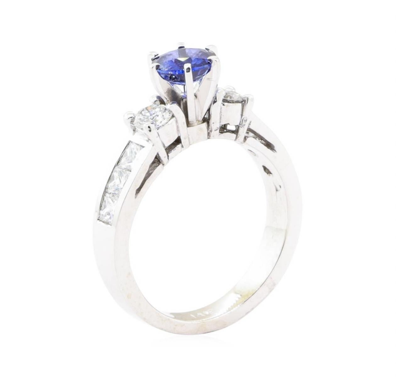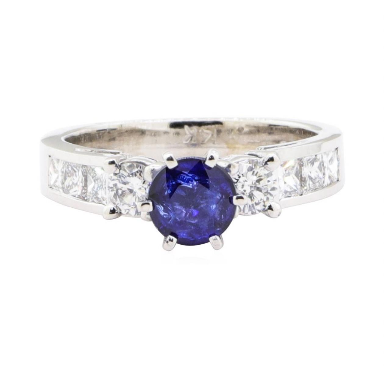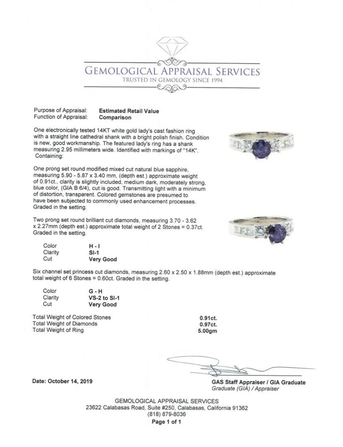 One electronically tested 14KT white gold lady's cast fashion ring with a straight line cathedral shank with a bright polish finish. The featured lady's ring has a shank measuring 2.95 millimeters wide. Identified with markings of '14K'. Condition is new, good workmanship. Containing: One prong set round modified mixed cut natural blue sapphire, measuring 5.90 - 5.87 x 3.40 mm, (depth est.) approximate weight of 0.91ct., clarity is slightly included, medium dark, moderately strong, blue color, (GIA B 6/4), cut is good. Transmitting light with a minimum of distortion, transparent. Colored gemstones are presumed to have been subjected to commonly used enhancement processes. Graded in the setting. Two prong set round brilliant cut diamonds, measuring 3.70 - 3.62 x 2.27mm (depth est.) approximate total weight of 2 Stones = 0.37ct. Graded in the setting. Color H - I Clarity SI-1 Cut Very Good Six channel set princess cut diamonds, measuring 2.60 x 2.50 x 1.88mm (depth est.) approximate total weight of 6 Stones = 0.60 ct. Graded in the setting. Color G - H Clarity VS-2 to SI-1 Cut Very Good. Total Weight of Colored Stones 0.91ct.. Total Weight of Diamonds 0.97ct.. Total Weight of Ring 5.00gm GAS Appraised at $4230.00. GAS Appraised.