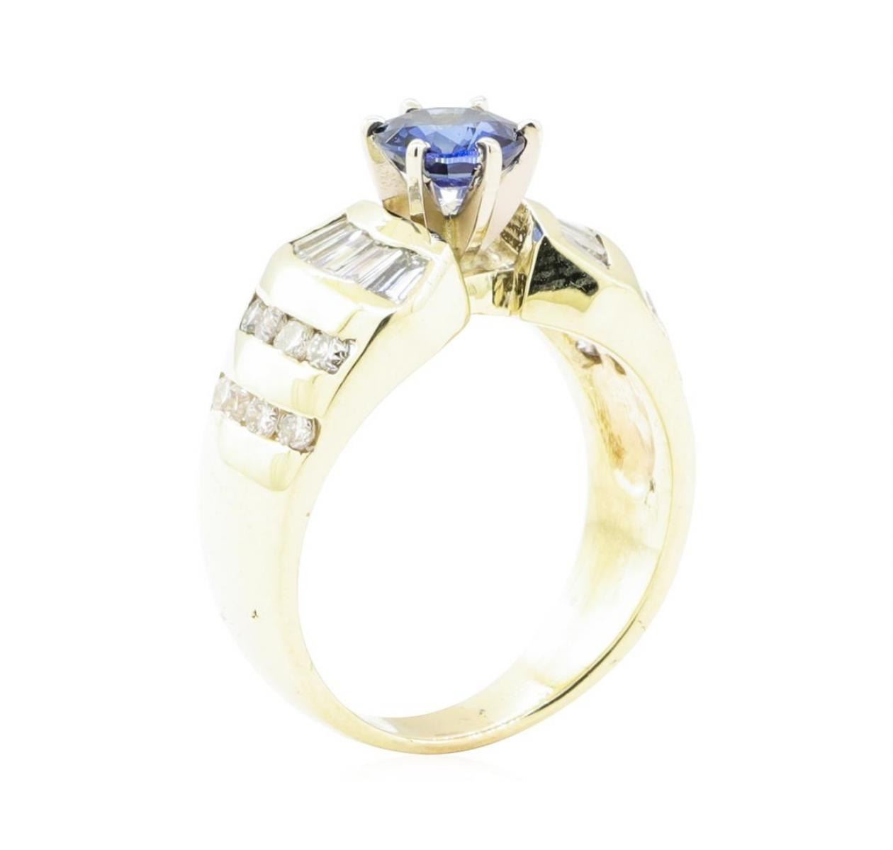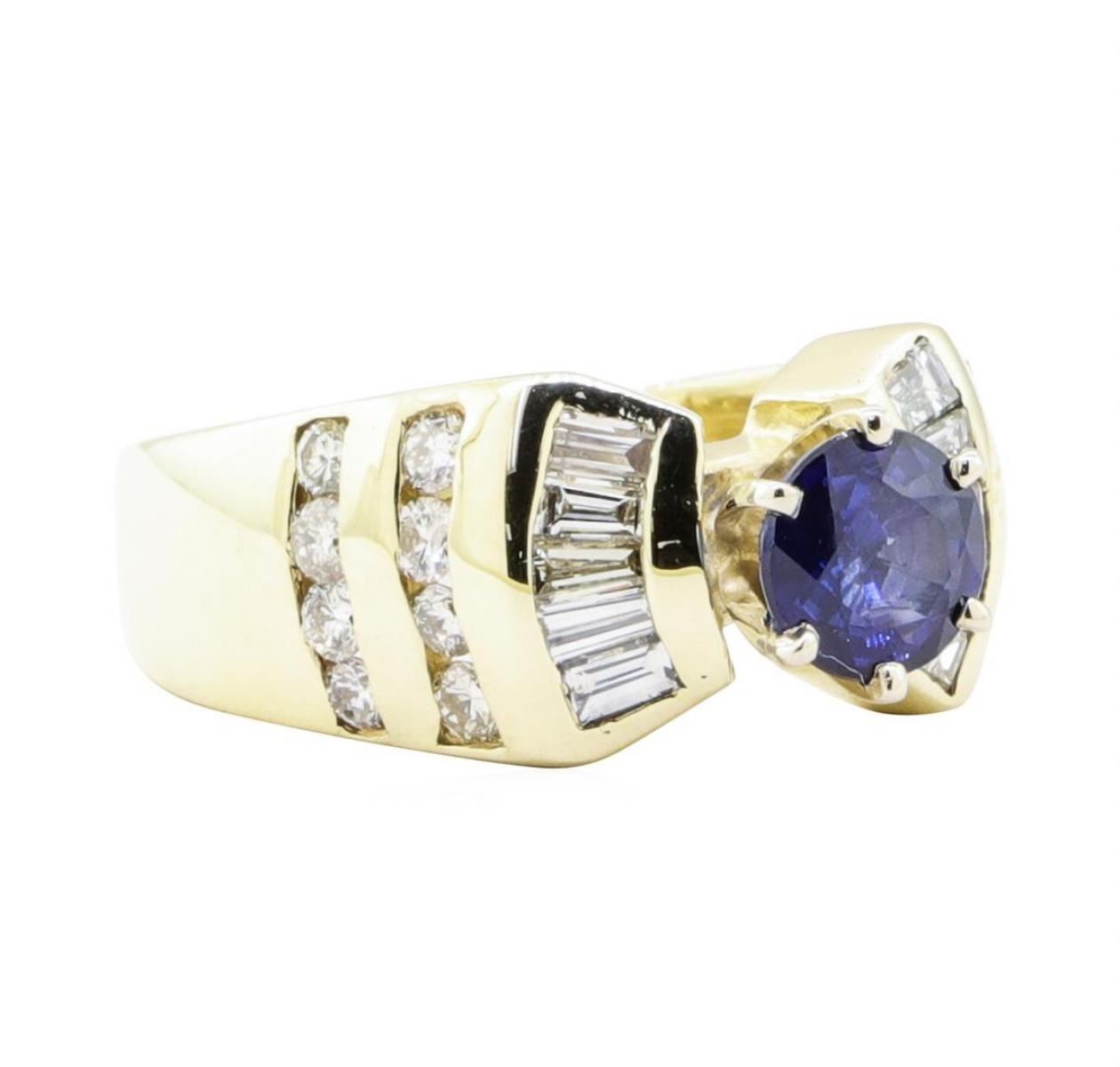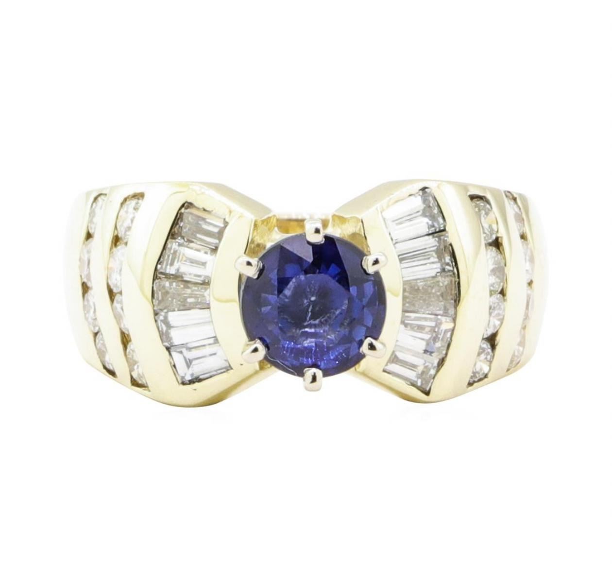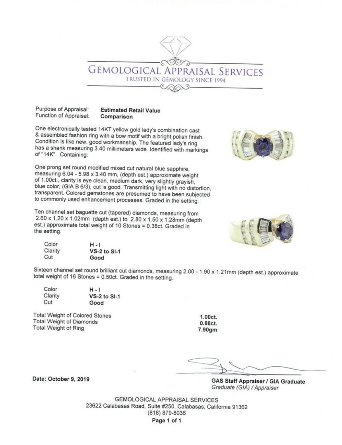 One electronically tested 14KT yellow gold lady's combination cast & assembled fashion ring with a bow motif with a bright polish finish. The featured lady's ring has a shank measuring 3.40 millimeters wide. Identified with markings of '14K'. Condition is Good. Containing: One prong set round modified mixed cut natural blue sapphire, measuring 6.04 - 5.98 x 3.40 mm, (depth est.) approximate weight of 1.00ct., clarity is eye clean, medium dark, very slightly grayish, blue color, (GIA B 6/3), cut is good. Transmitting light with no distortion, transparent. Colored gemstones are presumed to have been subjected to commonly used enhancement processes. Graded in the setting. Ten channel set baguette cut (tapered) diamonds, measuring from 2.60 x 1.20 x 1.02mm (depth est.) to 2.80 x 1.50 x 1.28mm (depth est.) approximate total weight of 10 Stones = 0.38ct. Graded in the setting. Color H - I Clarity VS-2 to SI-1 Cut Good Sixteen channel set round brilliant cut diamonds, measuring 2.00 - 1.90 x 1.21mm (depth est.) approximate total weight of 16 Stones = 0.50ct. Graded in the setting. Color H - I Clarity VS-2 to SI-1 Cut Good. Total Weight of Colored Stones 1.00ct.. Total Weight of Diamonds 0.88ct.. Total Weight of Ring 7.90gm GAS Appraised at $4190.00. GAS Appraised at $4,190.00.
