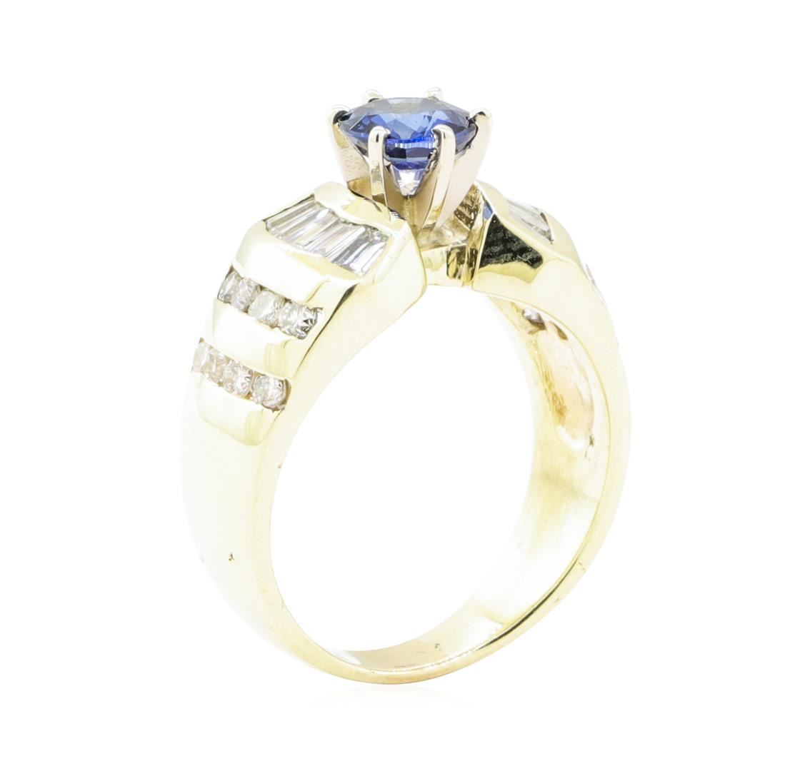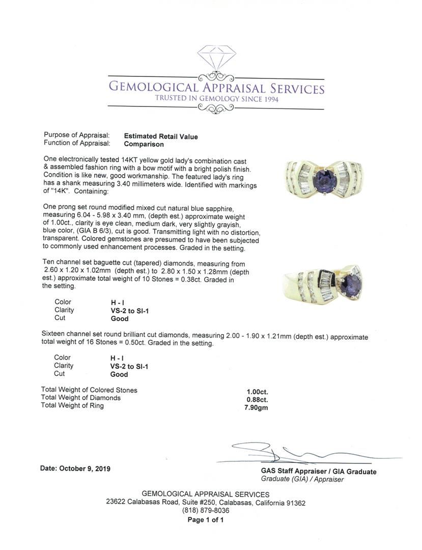 One electronically tested 14KT yellow gold lady's combination cast & assembled fashion ring with a bow motif with a bright polish finish. The featured lady's ring has a shank measuring 3.40 millimeters wide. Identified with markings of '14K'. Condition is Good. Containing: One prong set round modified mixed cut natural blue sapphire, measuring 6.04 - 5.98 x 3.40 mm, (depth est.) approximate weight of 1.00ct., clarity is eye clean, medium dark, very slightly grayish, blue color, (GIA B 6/3), cut is good. Transmitting light with no distortion, transparent. Colored gemstones are presumed to have been subjected to commonly used enhancement processes. Graded in the setting. Ten channel set baguette cut (tapered) diamonds, measuring from 2.60 x 1.20 x 1.02mm (depth est.) to 2.80 x 1.50 x 1.28mm (depth est.) approximate total weight of 10 Stones = 0.38ct. Graded in the setting. Color H - I Clarity VS-2 to SI-1 Cut Good Sixteen channel set round brilliant cut diamonds, measuring 2.00 - 1.90 x 1.21mm (depth est.) approximate total weight of 16 Stones = 0.50ct. Graded in the setting. Color H - I Clarity VS-2 to SI-1 Cut Good. Total Weight of Colored Stones 1.00ct.. Total Weight of Diamonds 0.88ct.. Total Weight of Ring 7.90gm GAS Appraised at $4190.00. GAS Appraised.