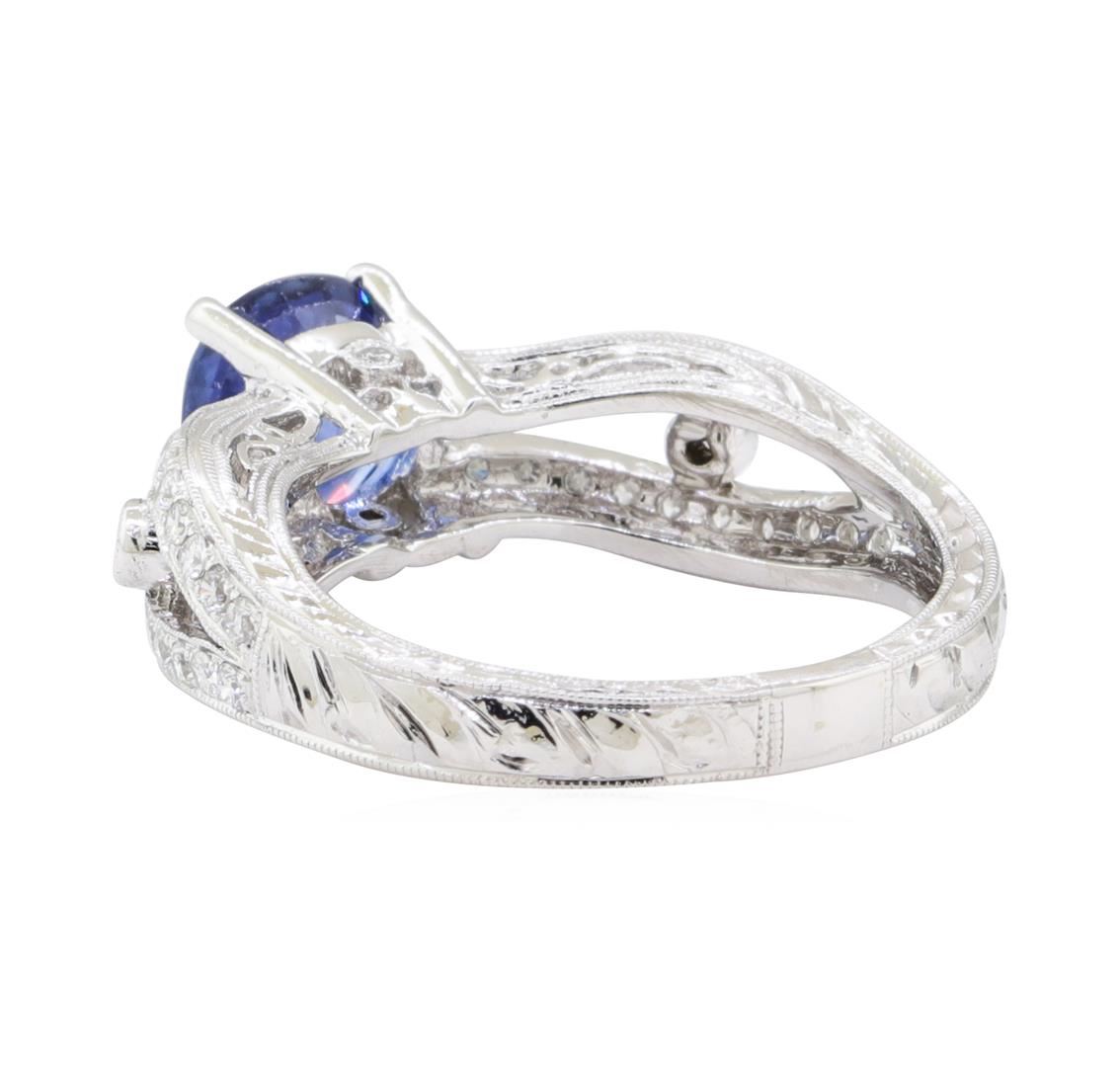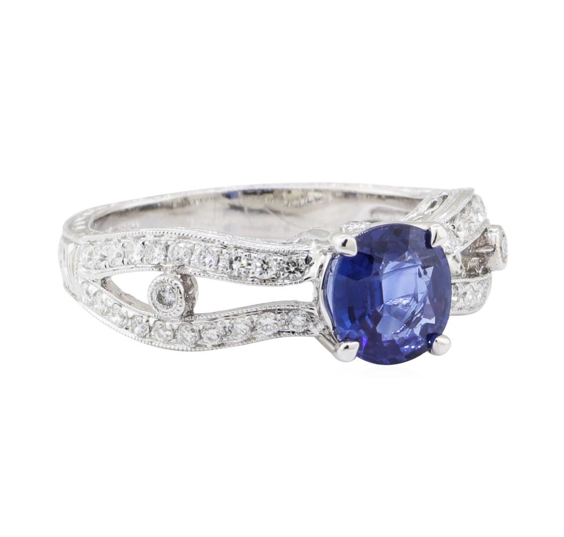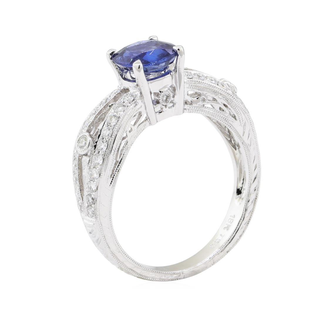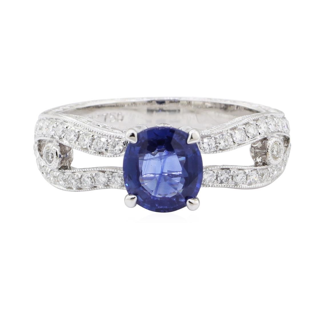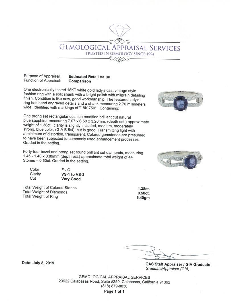 One electronically tested 18KT white gold lady's cast vintage style fashion ring with a split shank with a bright polish with milgrain detailing finish. The featured lady's ring has hand engraved details and a shank measuring 2.70 millimeters wide. Identified with markings of '18K 750'. Condition is like new, good workmanship. Containing: One prong set rectangular cushion modified brilliant cut natural blue sapphire, measuring 7.07 x 6.50 x 3.20mm, (depth est.) approximate weight of 1.38ct., clarity is slightly included, medium, moderately strong, blue color, (GIA B 5/4), cut is good. Transmitting light with a minimum of distortion, transparent. Colored gemstones are presumed to have been subjected to commonly used enhancement processes. Graded in the setting. Forty-Four bezel and prong set round brilliant cut diamonds, measuring 1.45 - 1.40 x 0.89mm (depth est.) approximate total weight of 44 Stones = 0.50ct. Graded in the setting. Color F - G Clarity VS-1 to VS-2 Cut Very Good. Total Weight of Colored Stones 1.38ct.. Total Weight of Diamonds 0.50ct.. Total Weight of Ring 5.40gm GAS Appraised at $4835.00. GAS Appraised.