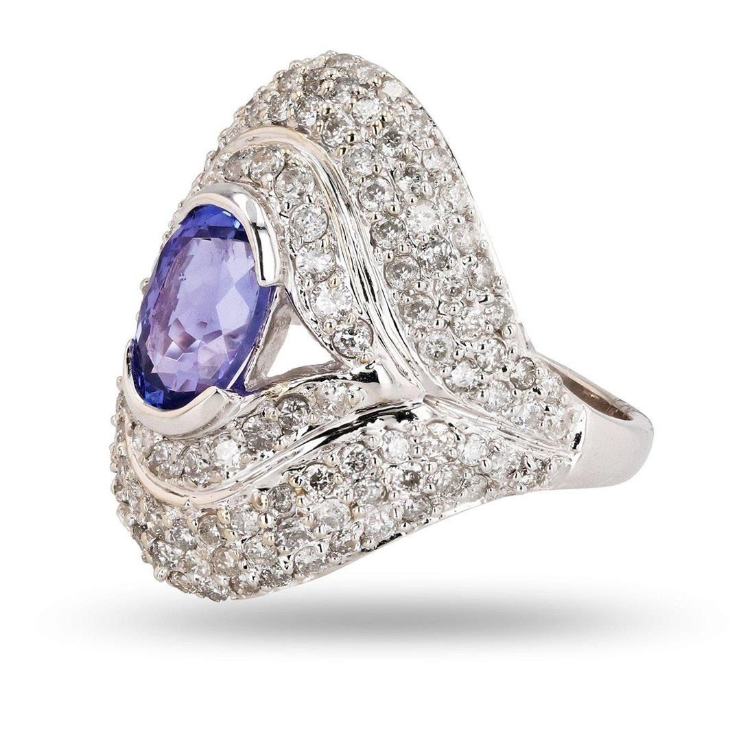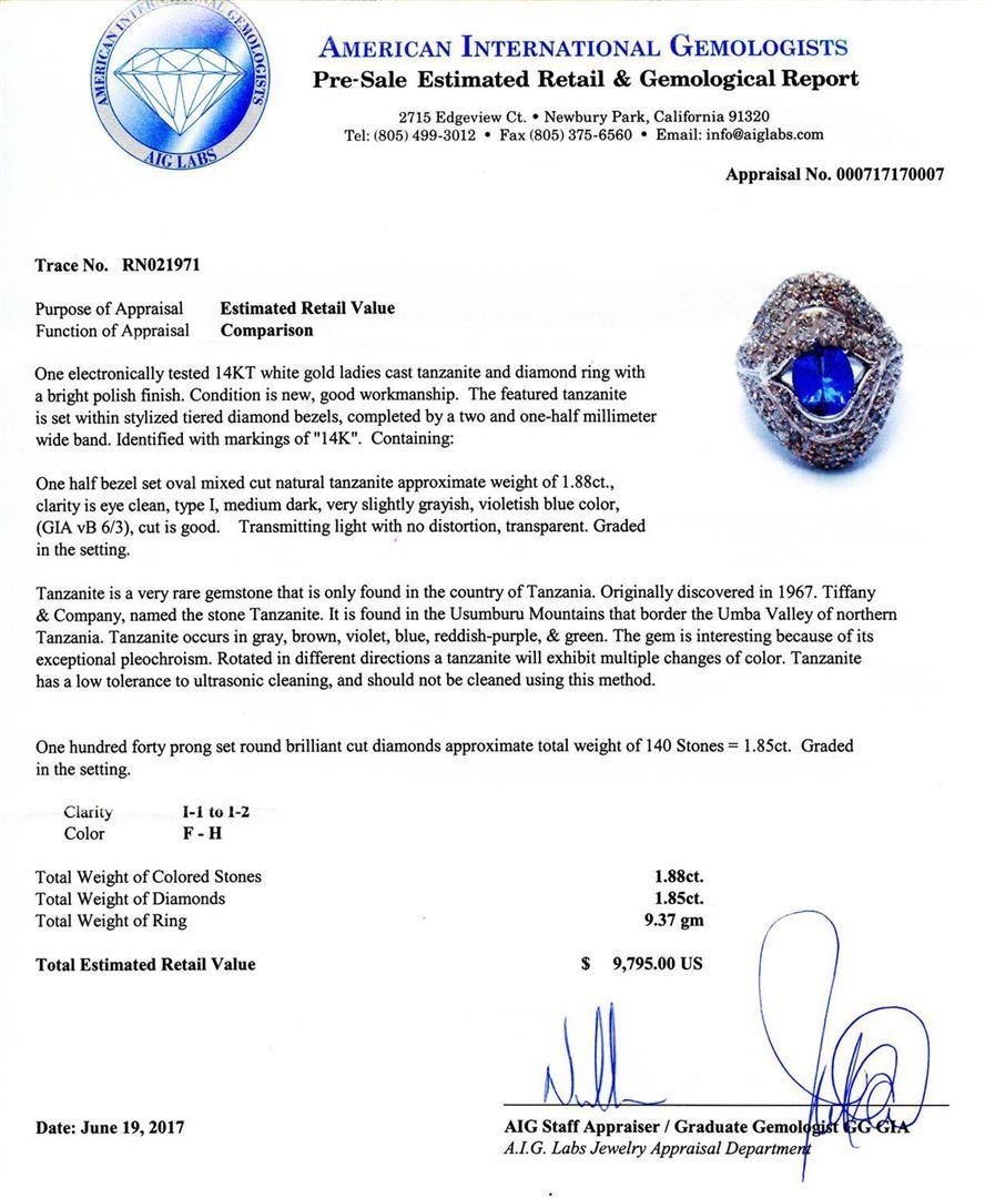 1.88ct Tanzanite and 1.85ctw Diamond 14K White Gold Ring. One electronically tested 14KT white gold ladies cast tanzanite and diamond ring with a bright polish finish. Condition is new, good workmanship. The featured tanzanite is set within stylized tiered diamond bezels, completed by a two and one-half millimeter wide band. Identified with markings of "14K". Containing: One half bezel set oval mixed cut natural tanzanite approximate weight of 1.88ct., clarity is eye clean, type I, medium dark, very slightly grayish, violetish blue color, (GIA vB 6/3), cut is good. Transmitting light with no distortion, transparent. Graded in the setting. Tanzanite is a very rare gemstone that is only found in the country of Tanzania. Originally discovered in 1967. Tiffany and Company, named the stone Tanzanite. It is found in the Usumburu Mountains that border the Umba Valley of northern Tanzania. Tanzanite occurs in gray, brown, violet, blue, reddish-purple, and green. The gem is interesting because of its exceptional pleochroism. Rotated in different directions a tanzanite will exhibit multiple changes of color. Tanzanite has a low tolerance to ultrasonic cleaning, and should not be cleaned using this method. One hundred forty prong set round brilliant cut diamonds approximate total weight of 140 Stones = 1.85ct. Graded in the setting. Clarity I1 to I2 Color F - H Total Weight of Colored Stones 1.88ct. Total Weight of Diamonds 1.85ct. Total Weight of Ring 9.37 gm