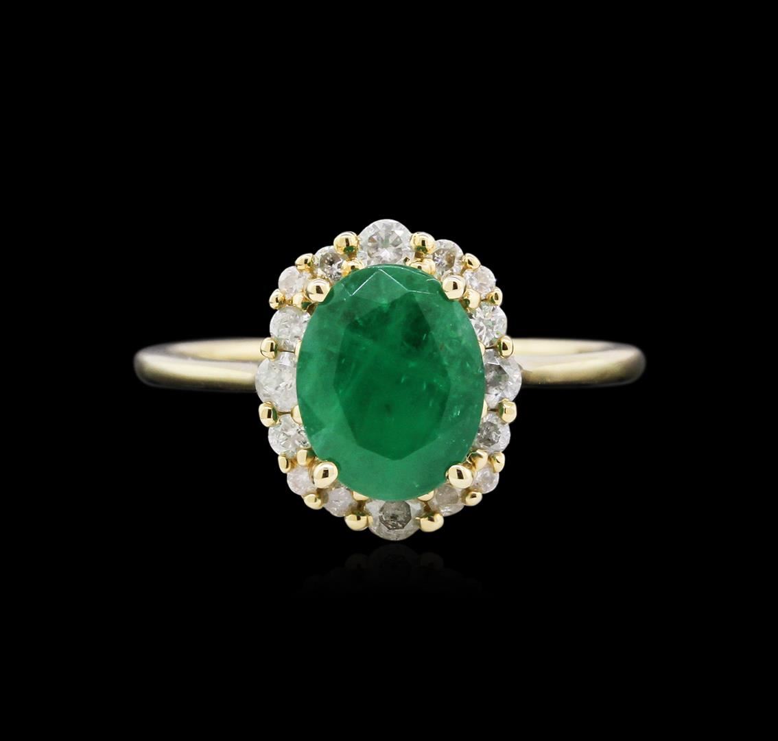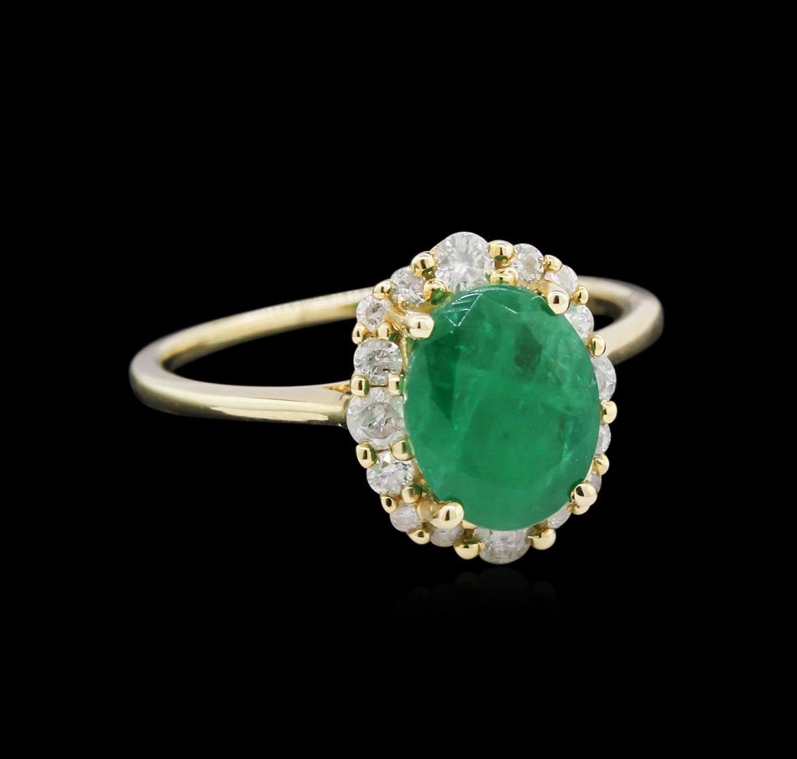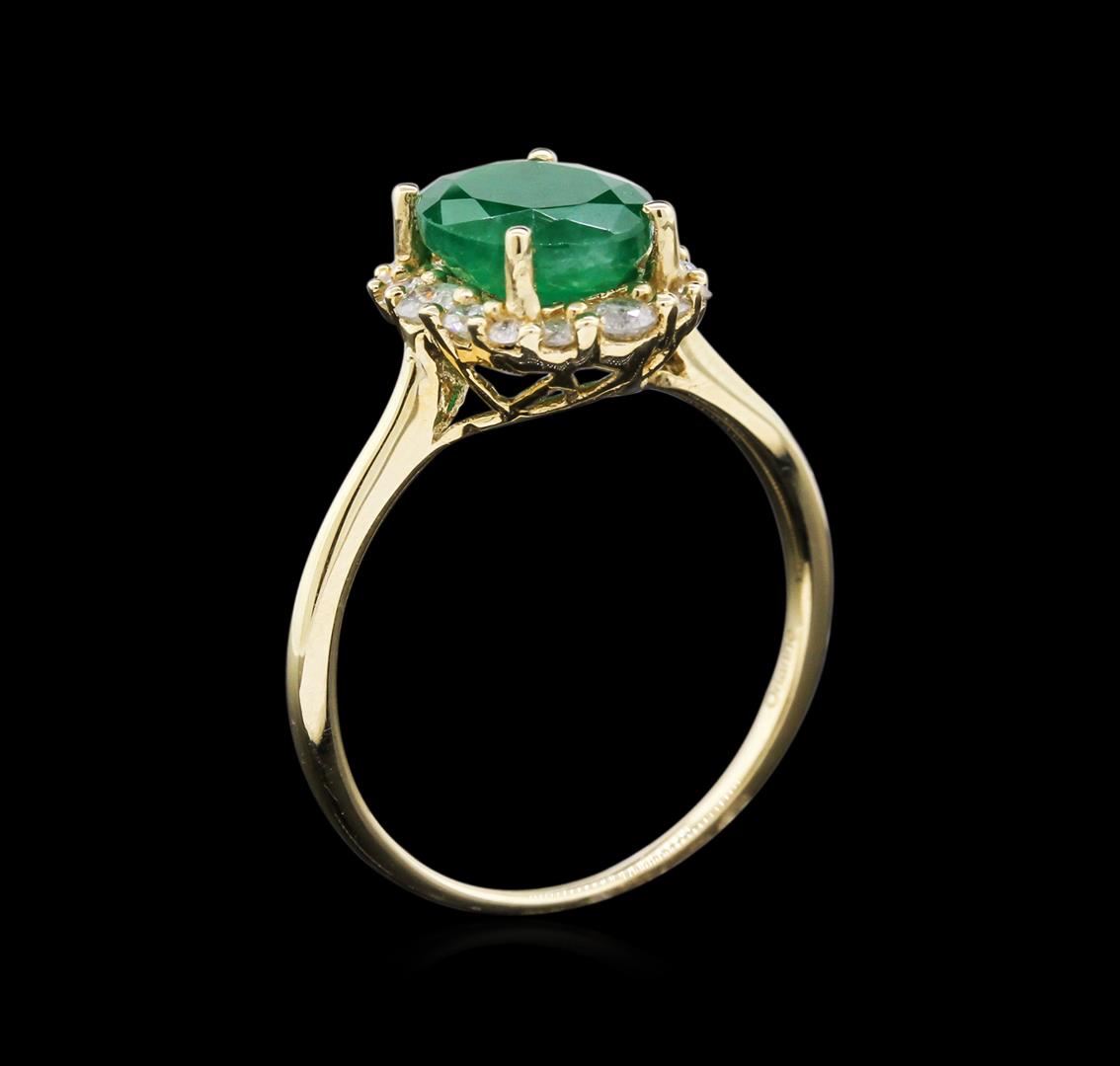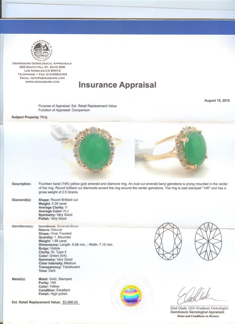 One 14KT yellow gold emerald and diamond ring. An oval cut emerald beryl gemstone is prong mounted in the center of the ring. Round brilliant cut diamonds accent the ring around the center gemstone. The ring is cast stamped "14K" and has a gross weight of 2.5 Grams. Diamond(s): Shape: Round Brilliant Cut. Weight: 0.39 carat. Average Clarity: I1. Average Color: H-J. Symmetry: Very Good. Polish: Very Good. GemStone(s): Emerald Beryl. Nature: Natural. Shape: Oval, Faceted. Quantity: 1, Mounted. Weight: 1.88 carat. Dimensions: Length - 8.98 mm. ; Width - 7.15 mm. Bulge: Visible. Clarity: SI, Type 3. Color: Green (4/4). Symmetry: Very Good. Color Intensity: Medium. Transparency: Translucent. Tone: Dark. Metal(s): Metal: Gold, Stamped. Purity: 14K. Color: Yellow. Condition: Excellent. Finish: High polish. GGA Appraised at $3,988.00.