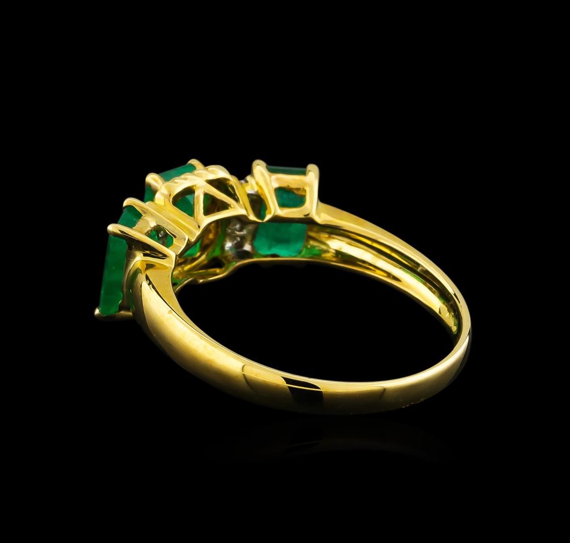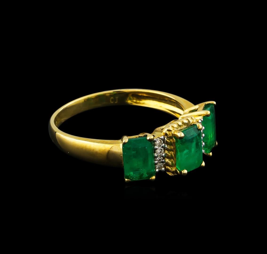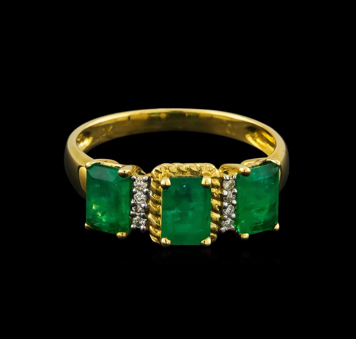 One ring featuring: 10KT yellow gold weighing 1.84 grams containing three emeralds with a total weight of 1.89ct and eight round diamonds with a total weight of 0.06ct.