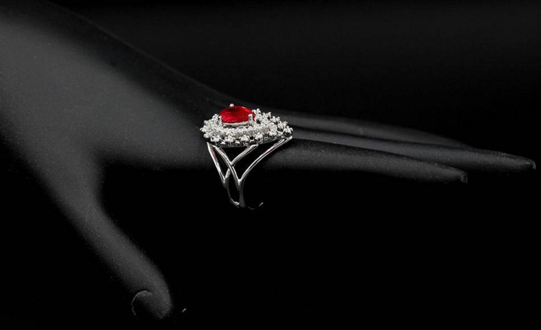 One anniversary band ring featuring: 14KT white gold weighing 6.67 grams containing one ruby weighing 1.89ct and 36 diamonds weighing 1.05ctw. The ruby is glass-filled and cut in a pear shape with fine clarity and red color with very good cut. The diamonds are round brilliant cut and are natural, unenhanced stones with SI-1 clarity, G color and very good cut. The ring is a size 7 but is resizable.