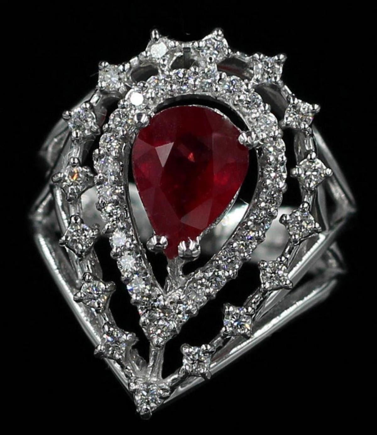 One anniversary band ring featuring: 14KT white gold weighing 6.67 grams containing one ruby weighing 1.89ct and 36 diamonds weighing 1.05ctw. The ruby is glass-filled and cut in a pear shape with fine clarity and red color with very good cut. The diamonds are round brilliant cut and are natural, unenhanced stones with SI-1 clarity, G color and very good cut. The ring is a size 7 but is resizable.