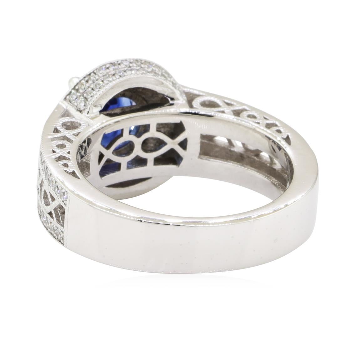 One electronically tested platinum lady's cast fashion ring with a double row wide band halo with a bright polish with milgrain detailing finish. The featured lady's ring has a shank measuring 4.30 millimeters wide. Identified with markings of 'PLAT'. Condition is new, good workmanship. Containing: One prong set oval modified mixed cut natural blue sapphire, measuring 6.73 x 5.73 x 3.30mm, (depth est.) approximate weight of 1.09ct., clarity is eye clean, medium dark, strong, blue color, (GIA B 6/5), cut is very good. Transmitting light with no distortion, transparent. Colored gemstones are presumed to have been subjected to commonly used enhancement processes. Graded in the setting. Sixteen prong set round brilliant cut diamonds, measuring 1.85 - 1.80 x 1.13mm (depth est.) approximate total weight of 16 Stones = 0.38ct. Graded in the setting. Color F - G Clarity VS-1 to VS-2 Cut Very Good Ninety prong set round brilliant cut diamonds, measuring 1.10 - 1.00 x 0.65mm (depth est.) approximate total weight of 90 Stones = 0.42ct. Graded in the setting. Color F - G Clarity VS-1 to SI-1 Cut Very Good. Total Weight of Colored Stones 1.09ct.. Total Weight of Diamonds 0.80ct.. Total Weight of Ring 10.60gm GAS Appraised at $8085.00. GAS Appraised at $8,085.00.