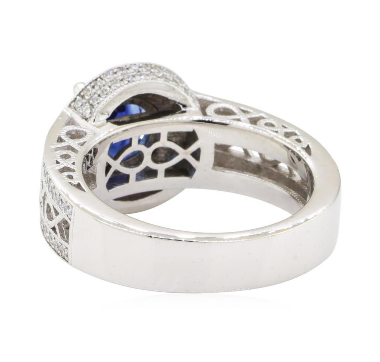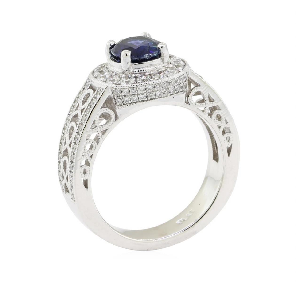 One electronically tested platinum lady's cast fashion ring with a double row wide band halo with a bright polish with milgrain detailing finish. The featured lady's ring has a shank measuring 4.30 millimeters wide. Identified with markings of 'PLAT'. Condition is new, good workmanship. Containing: One prong set oval modified mixed cut natural blue sapphire, measuring 6.73 x 5.73 x 3.30mm, (depth est.) approximate weight of 1.09ct., clarity is eye clean, medium dark, strong, blue color, (GIA B 6/5), cut is very good. Transmitting light with no distortion, transparent. Colored gemstones are presumed to have been subjected to commonly used enhancement processes. Graded in the setting. Sixteen prong set round brilliant cut diamonds, measuring 1.85 - 1.80 x 1.13mm (depth est.) approximate total weight of 16 Stones = 0.38ct. Graded in the setting. Color F - G Clarity VS-1 to VS-2 Cut Very Good Ninety prong set round brilliant cut diamonds, measuring 1.10 - 1.00 x 0.65mm (depth est.) approximate total weight of 90 Stones = 0.42ct. Graded in the setting. Color F - G Clarity VS-1 to SI-1 Cut Very Good. Total Weight of Colored Stones 1.09ct.. Total Weight of Diamonds 0.80 ct.. Total Weight of Ring 10.60gm GAS Appraised at $8085.00. GAS Appraised.