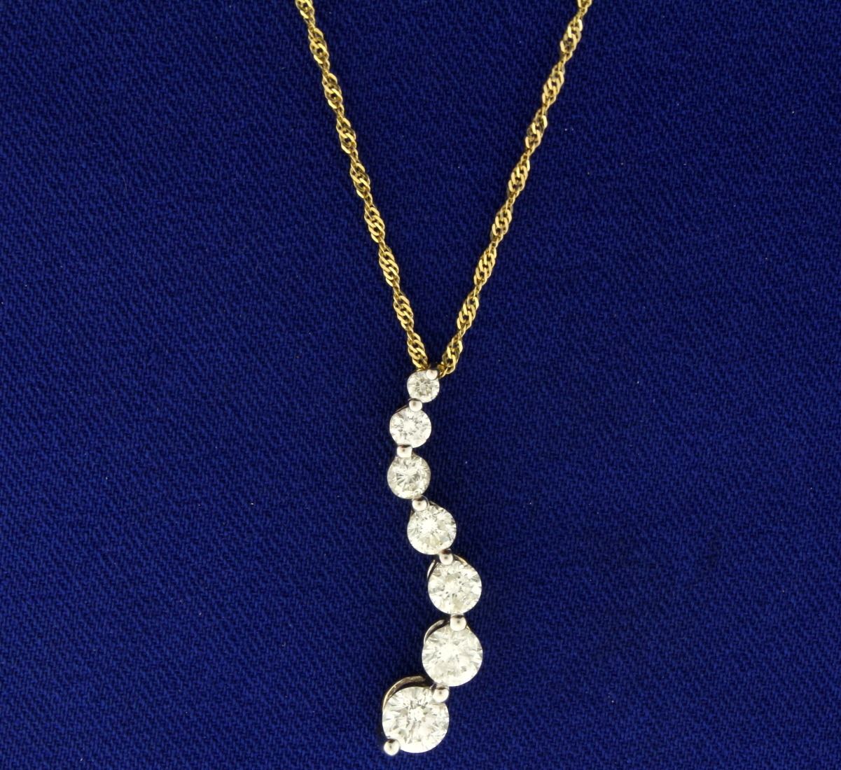In 14k yellow gold, pendant contains .4,.3,.2,.16,.11,.09, and .04ct high quality diamonds of SI2 clarity/G color. Diamonds are well cut with lots of sparkle. Also contains forty baguette diamonds totaling 1/2ct of similar quality. Comes with 21 inch chain. Pendant is 1 1/8 inches long. 3.5g