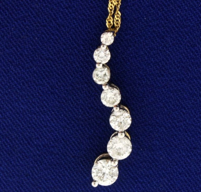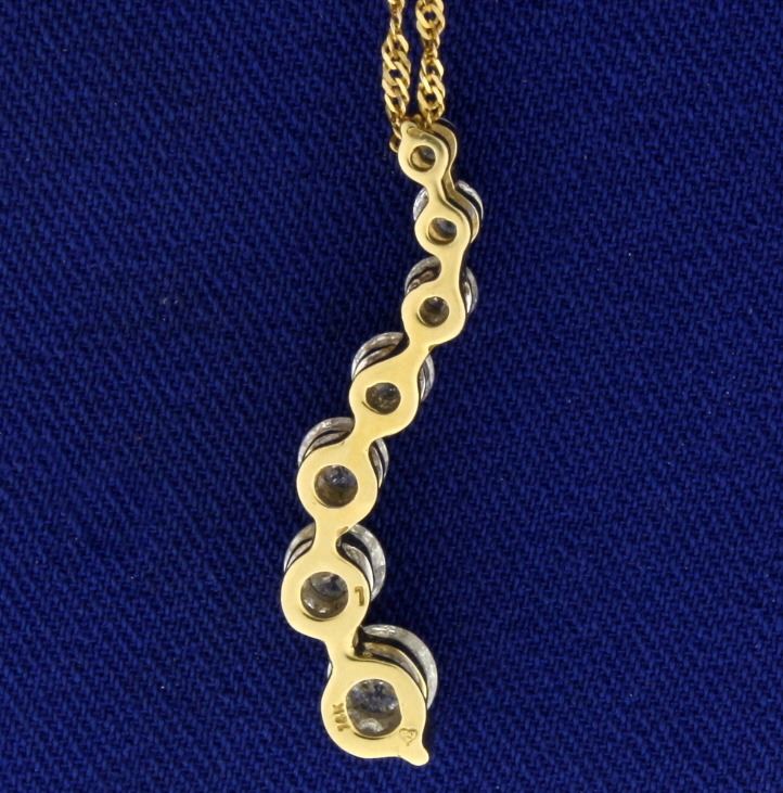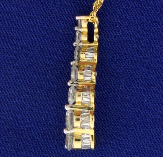In 14k yellow gold, pendant contains .4,.3,.2,.16,.11,.09, and .04ct high quality diamonds of SI2 clarity/G color. Diamonds are well cut with lots of sparkle. Also contains forty baguette diamonds totaling 1/2ct of similar quality. Comes with 21 inch chain. Pendant is 1 1/8 inches long. 3.5g