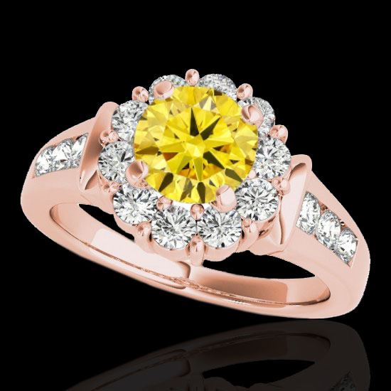 REF-206T4M -34300 ---- 1.9 CTW Certified Si/I Fancy Intense Yellow Diamond Solitaire Halo Ring 10K Rose Gold ---- Luxury Designer Brand Ring Appraised at $13,600 Certificate Number US34300 10k Rose gold, Ring Size is 7, Ring measuring approx. Uniform, weighing in total approx. 5.7 grams. Made in the USA and is stamped 10k, Main stone 1 carat total weight containing 1 pieces of Intense Fancy Yellow color with SI quality Round shape cut Diamond , Stone #2 0.9 carat total weight containing 16 pieces of H-I color with VS/SI quality Round shape cut Diamond