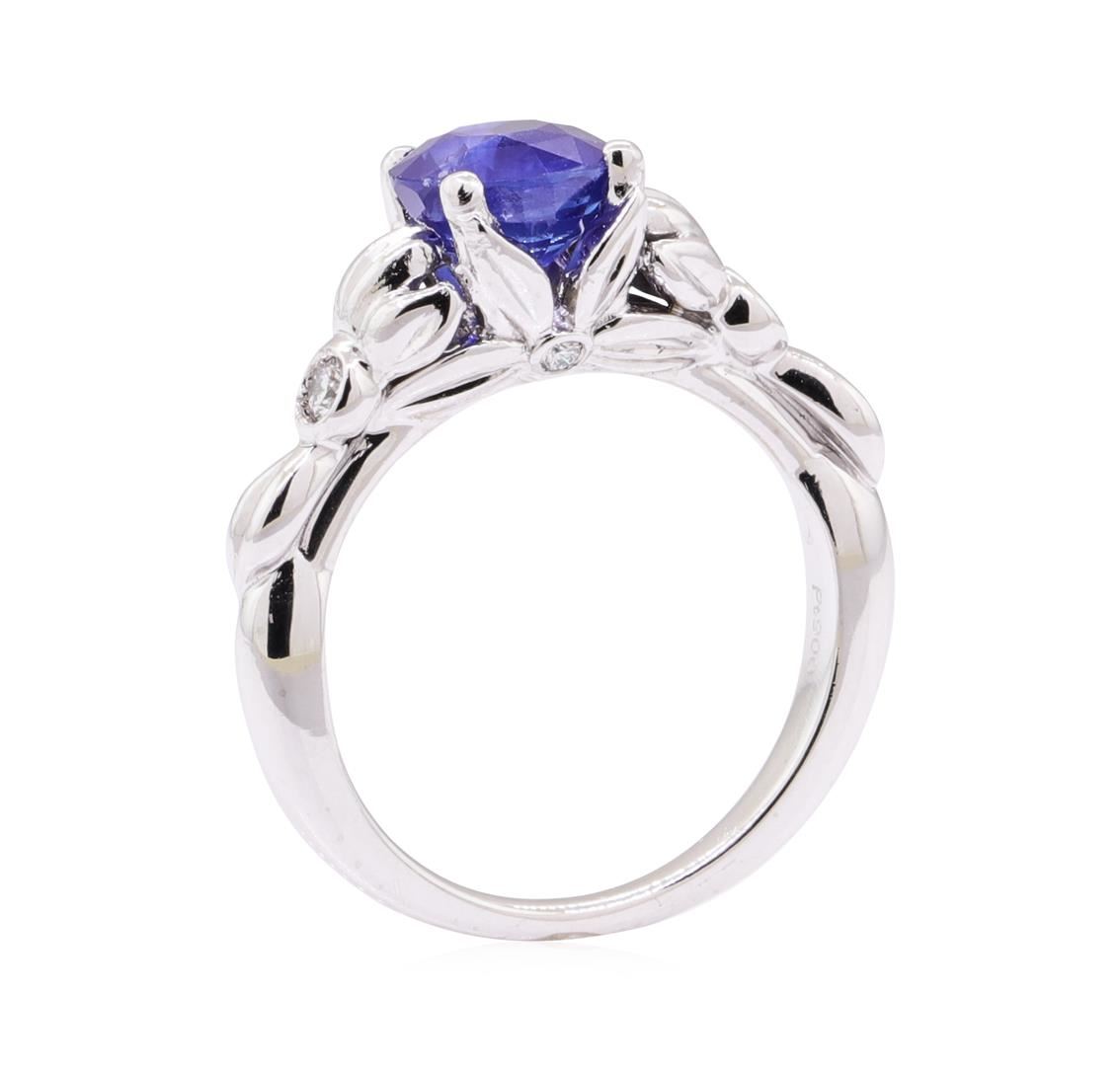One ring featuring: platinum weighing 7.2 grams containing one round cut blue sapphire weighing 1.76ct and diamonds weighing 0.14ctw. The ring has a floral solitaire motif.