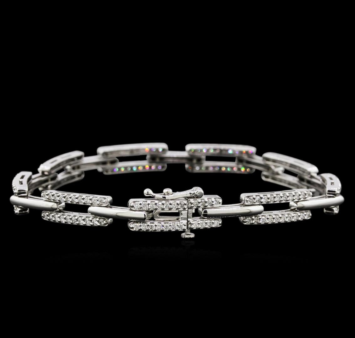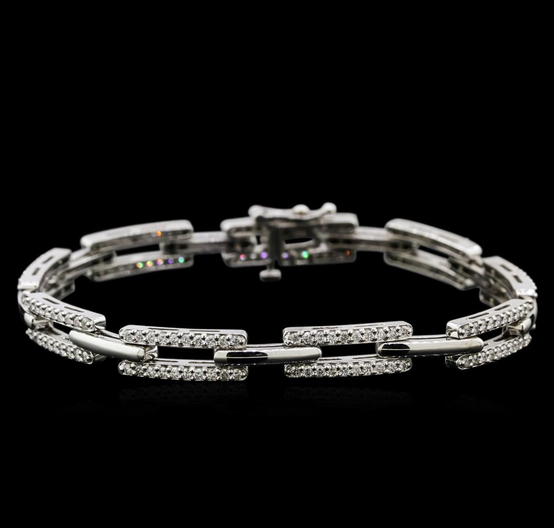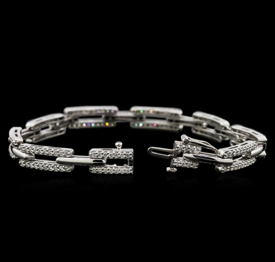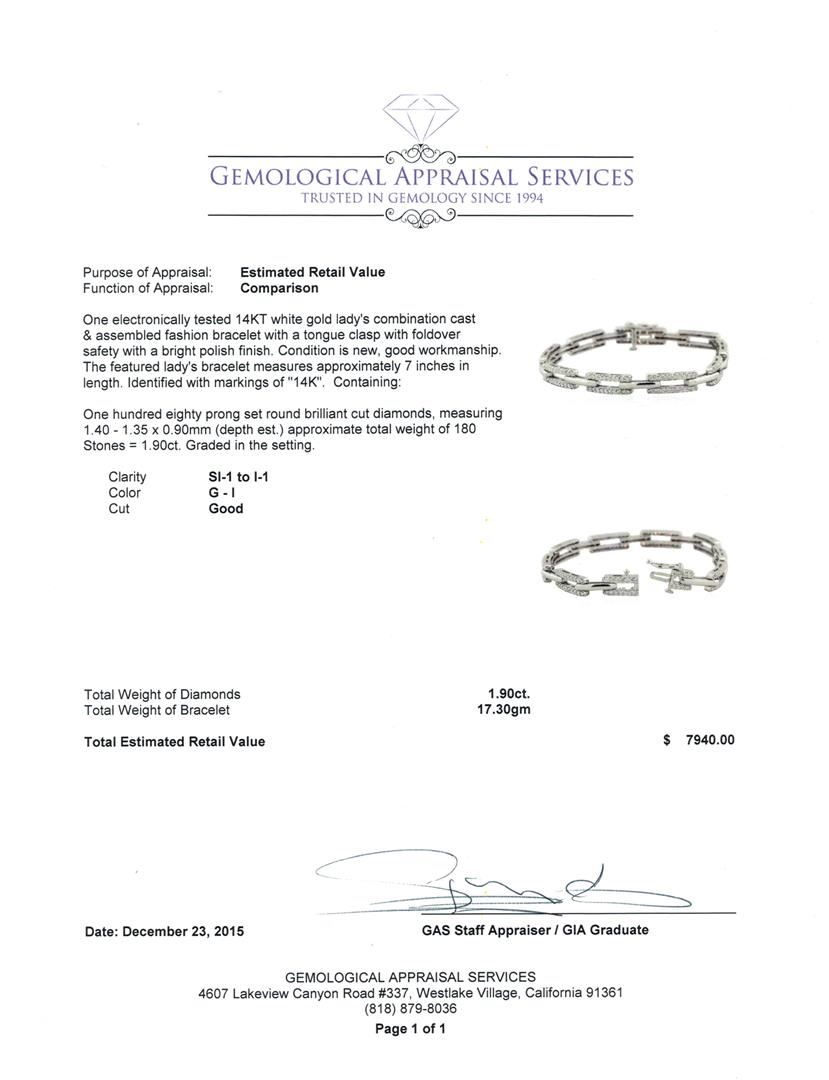 One electronically tested 14KT white gold lady's combination cast & assembled fashion bracelet with a tongue clasp with foldover safety with a bright polish finish. The featured lady's bracelet measures approximately 7 inches in length. Identified with markings of "14K". Condition is new, good workmanship. Containing: One Hundred Eighty prong set round brilliant cut diamonds, measuring 1.40 - 1.35 x 0.90mm (depth est.) approximate total weight of 180 Stones = 1.90ct. Graded in the setting. Clarity: SI-1 to I-1. Color: G - I. Cut Good. Total Weight of Diamonds 1.90ct. Total Weight of Bracelet 17.30gm. GAS Appraised at $7,940.00.