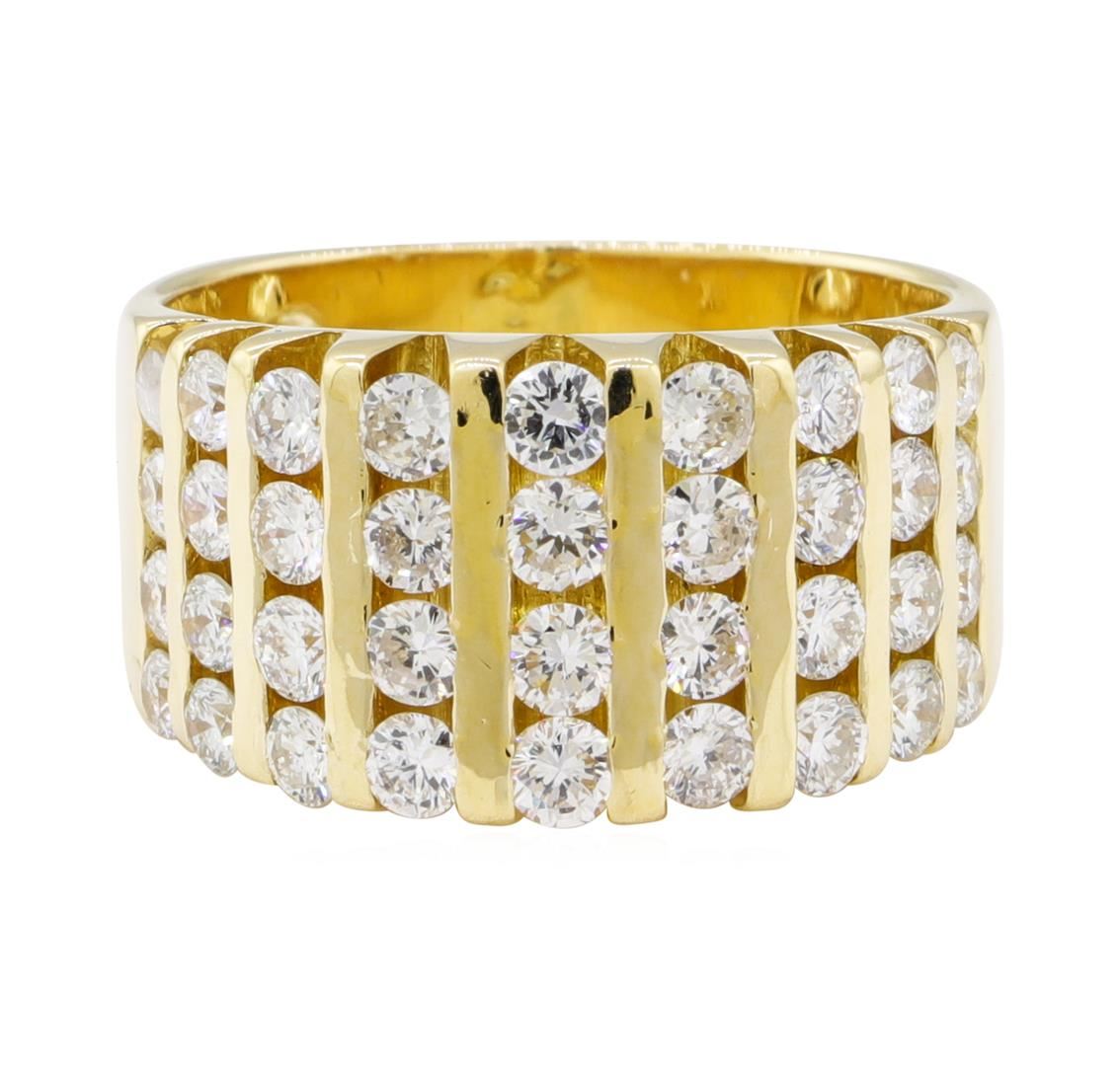 One electronically tested 18KT yellow gold lady's cast fashion ring with a tapered flat wide band with a bright polish finish. The featured lady's ring has sizing balls and a European shank measuring 6.60 millimeters wide. Identified with markings of '18K'. Condition is used, good workmanship. Containing: Thirty-Six channel set round brilliant cut diamonds, measuring 2.60 - 2.20 x 1.49mm (depth est.) approximate total weight of 36 Stones = 1.90ct. One of the featured diamonds is chipped. Graded in the setting. Color G - H Clarity VS-1 to VS-2 Cut Very Good. Total Weight of Diamonds 1.90ct.. Total Weight of Ring 14.30gm GAS Appraised at $9130.00. GAS Appraised at $9,130.00.