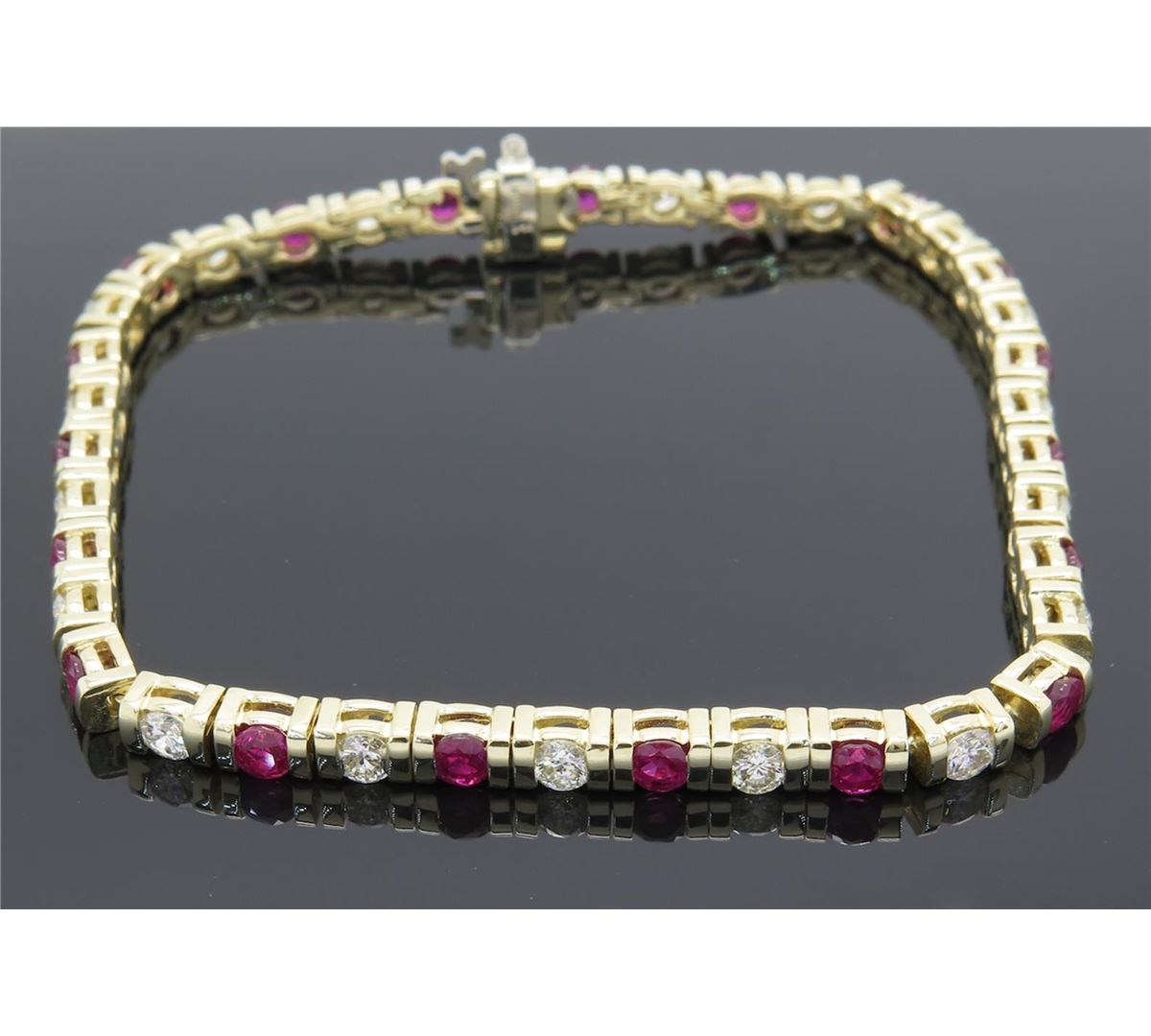 One tested 14K yellow gold diamond and ruby bracelet. Condition is new. Containing: 19 Round Brilliant Cut Diamonds. Clarity: I-SI, Color: G-I. Approximate total diamond weight: 1.90CTW. 19 round rubies. Diamonds are graded in the mounting, unless otherwise stated. Weight of bracelet: 15.2 grams. Size: 7.5" long