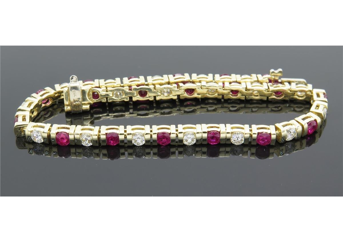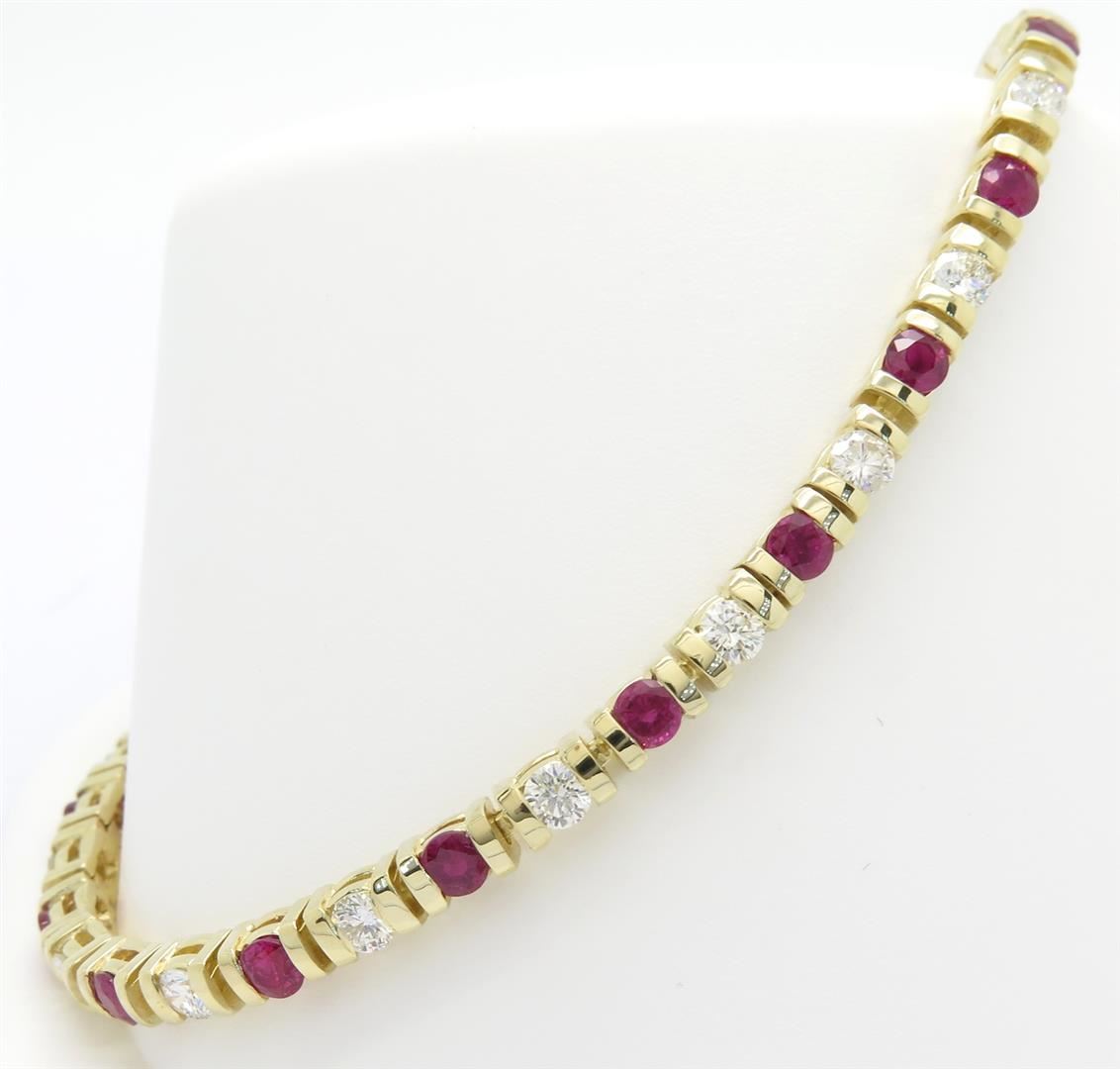 One tested 14K yellow gold diamond and ruby bracelet. Condition is new. Containing: 19 Round Brilliant Cut Diamonds. Clarity: I-SI, Color: G-I. Approximate total diamond weight: 1.90CTW. 19 round rubies. Diamonds are graded in the mounting, unless otherwise stated. Weight of bracelet: 15.2 grams. Size: 7.5" long