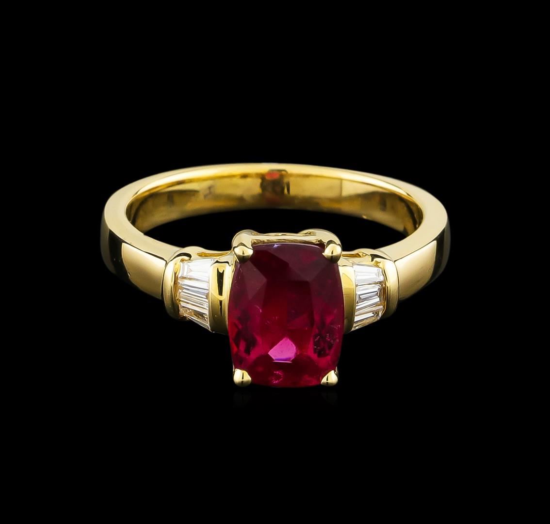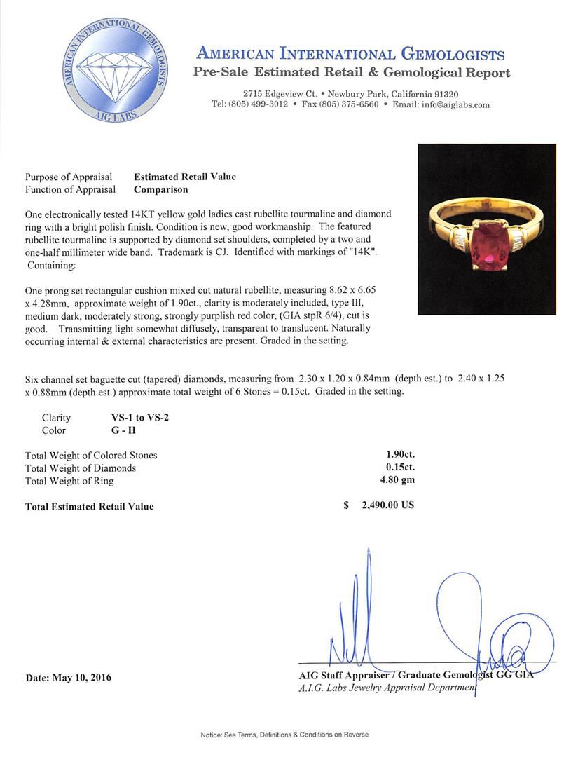 One electronically tested 14KT yellow gold ladies cast rubellite tourmaline and diamond ring with a bright polish finish. The featured rubellite tourmaline is supported by diamond set shoulders, completed by a two and one-half millimeter wide band. Trademark is CJ. Identified with markings of "14K". Condition is new, good workmanship. Containing: One prong set rectangular cushion mixed cut natural rubellite, measuring 8.62 x 6.65 x 4.28mm, approximate weight of 1.90ct., clarity is moderately included, type III, medium dark, moderately strong, strongly purplish red color, (GIA stpR 6/4), cut is good. Transmitting light somewhat diffusely, transparent to translucent. Naturally occurring internal & external characteristics are present. Graded in the setting. Six channel set baguette cut (tapered) diamonds, measuring from 2.30 x 1.20 x 0.84mm (depth est.) to 2.40 x 1.25 x 0.88mm (depth est.) approximate total weight of 6 Stones = 0.15ct. Graded in the setting. Clarity: VS-1 to VS-2. Color: G - H. Total Weight of Colored Stones 1.90ct. Total Weight of Diamonds 0.15ct. Total Weight of Ring 4.80gm. AIG Appraised at $2,490.00.