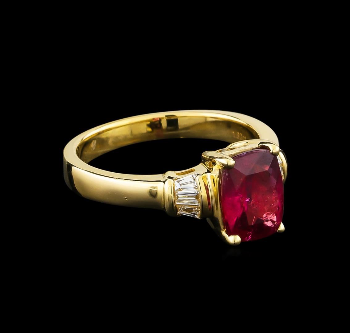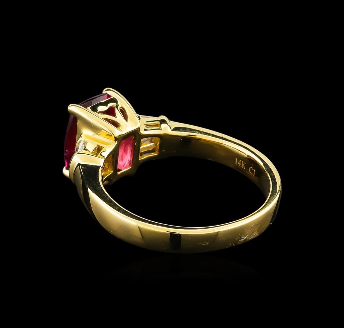 One electronically tested 14KT yellow gold ladies cast rubellite tourmaline and diamond ring with a bright polish finish. The featured rubellite tourmaline is supported by diamond set shoulders, completed by a two and one-half millimeter wide band. Trademark is CJ. Identified with markings of "14K". Condition is new, good workmanship. Containing: One prong set rectangular cushion mixed cut natural rubellite, measuring 8.62 x 6.65 x 4.28mm, approximate weight of 1.90ct., clarity is moderately included, type III, medium dark, moderately strong, strongly purplish red color, (GIA stpR 6/4), cut is good. Transmitting light somewhat diffusely, transparent to translucent. Naturally occurring internal & external characteristics are present. Graded in the setting. Six channel set baguette cut (tapered) diamonds, measuring from 2.30 x 1.20 x 0.84mm (depth est.) to 2.40 x 1.25 x 0.88mm (depth est.) approximate total weight of 6 Stones = 0.15ct. Graded in the setting. Clarity: VS-1 to VS-2. Color: G - H. Total Weight of Colored Stones 1.90ct. Total Weight of Diamonds 0.15ct. Total Weight of Ring 4.80gm. AIG Appraised at $2,490.00.