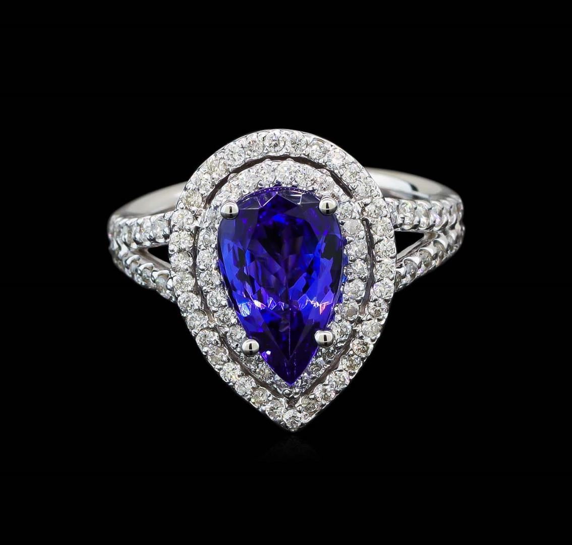 One electronically tested 14KT white gold lady's cast fashion ring with a split shank double basket halo with a bright polish finish. The featured lady's ring has a double shank measuring 4.70 millimeters wide. Identified with markings of '14K'. Condition is new, good workmanship. Containing: One prong set pear modified brilliant cut natural tanzanite, measuring 11.00 x 6.92 x 3.75mm, (depth est.) approximate weight of 1.90ct., clarity is eye clean, medium dark, moderately strong, violetish blue color, (GIA vB 6/4), cut is very good. Transmitting light with no distortion, transparent. Colored gemstones are presumed to have been subjected to commonly used enhancement processes. Graded in the setting. Thirty-Two prong set round brilliant cut diamonds, measuring 1.40 - 1.35 x 0.86mm (depth est.) approximate total weight of 32 Stones = 0.32ct. Graded in the setting. Clarity SI-1 to I-1. Color: H - I Cut Good Sixty-Two prong set round brilliant cut diamonds, measuring 1.20 - 1.15 x 0.73mm (depth est.) approximate total weight of 62 Stones = 0.38ct. Graded in the setting. Clarity SI-1 to SI-2. Color: H - I Cut Good. Total Weight of Colored Stones 1.90ct.. Total Weight of Diamonds 0.70ct.. Total Weight of Ring 5.60gm. GAS Appraised at $5,960.00.