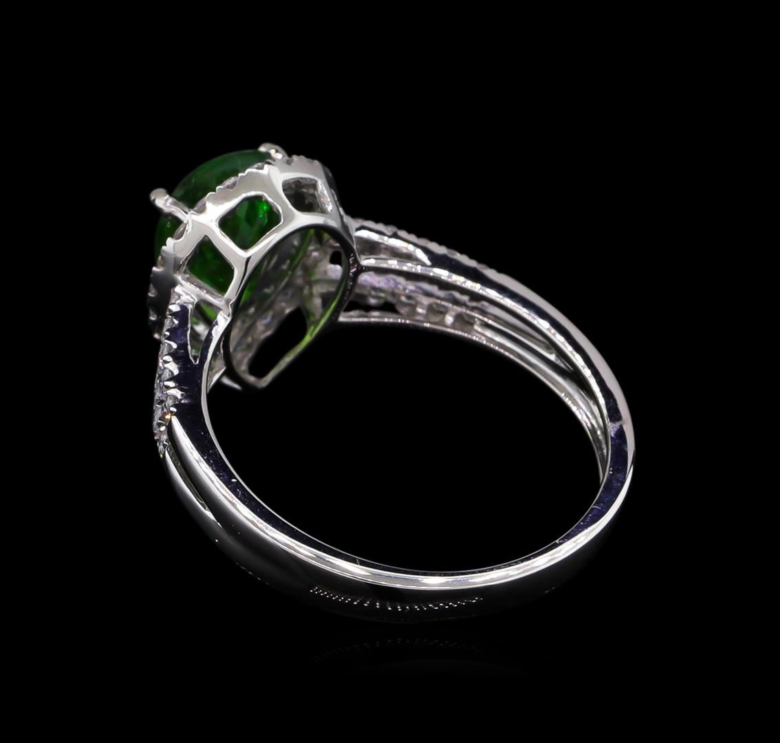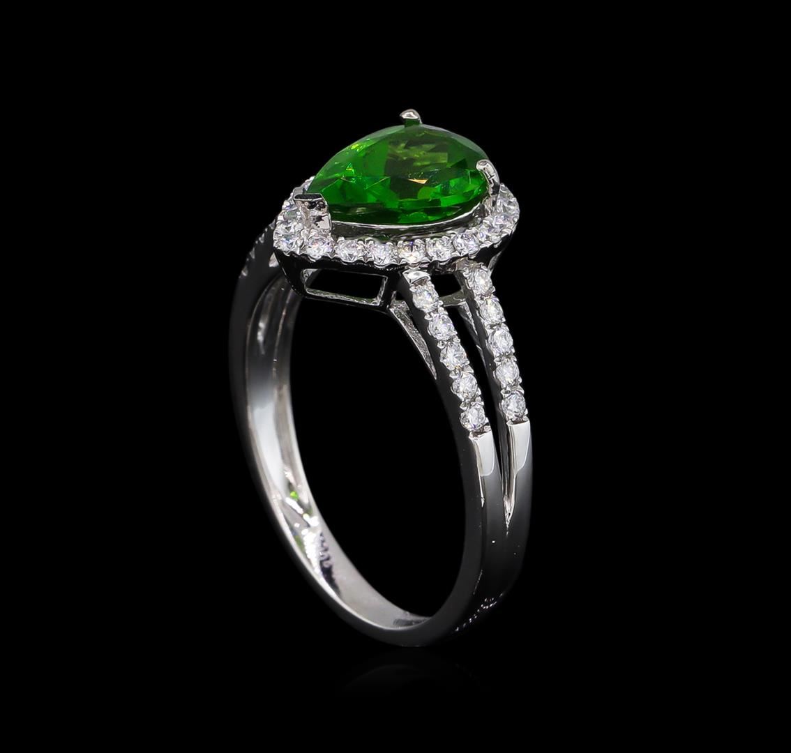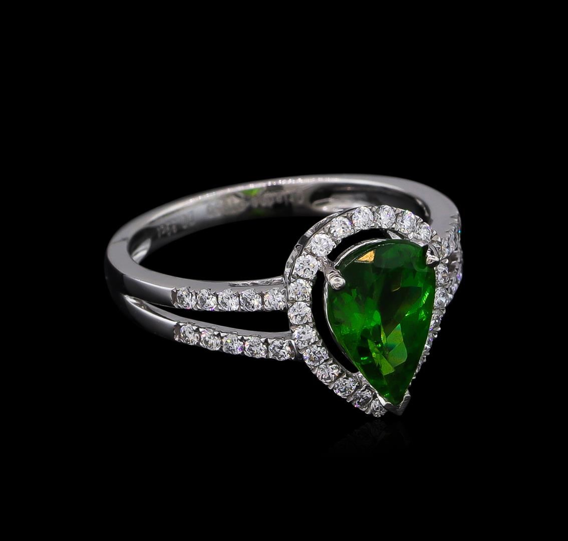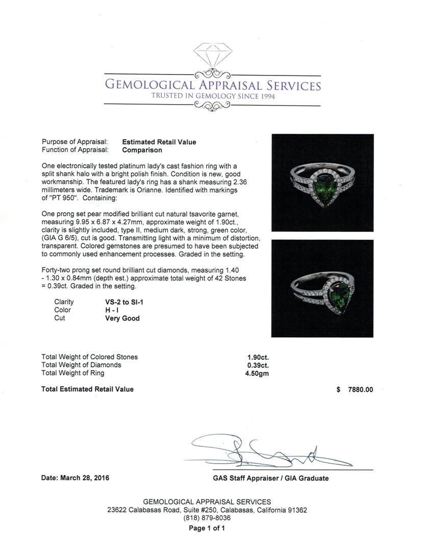 One electronically tested platinum lady's cast fashion ring with a split shank halo with a bright polish finish. The featured lady's ring has a shank measuring 2.36 millimeters wide. Trademark is Orianne. Identified with markings of "PT 950". Condition is new, good workmanship. Containing: One prong set pear modified brilliant cut natural tsavorite garnet, measuring 9.95 x 6.87 x 4.27mm, approximate weight of 1.90ct., clarity is slightly included, type II, medium dark, strong, green color, (GIA G 6/5), cut is good. Transmitting light with a minimum of distortion, transparent. Colored gemstones are presumed to have been subjected to commonly used enhancement processes. Graded in the setting. Forty-Two prong set round brilliant cut diamonds, measuring 1.40 - 1.30 x 0.84mm (depth est.) approximate total weight of 42 Stones = 0.39ct. Graded in the setting. Clarity: VS-2 to SI-1. Color: H - I. Cut Very Good. Total Weight of Colored Stones 1.90ct. Total Weight of Diamonds 0.39ct. Total Weight of Ring 4.50gm. GAS Appraised at $7,880.00.