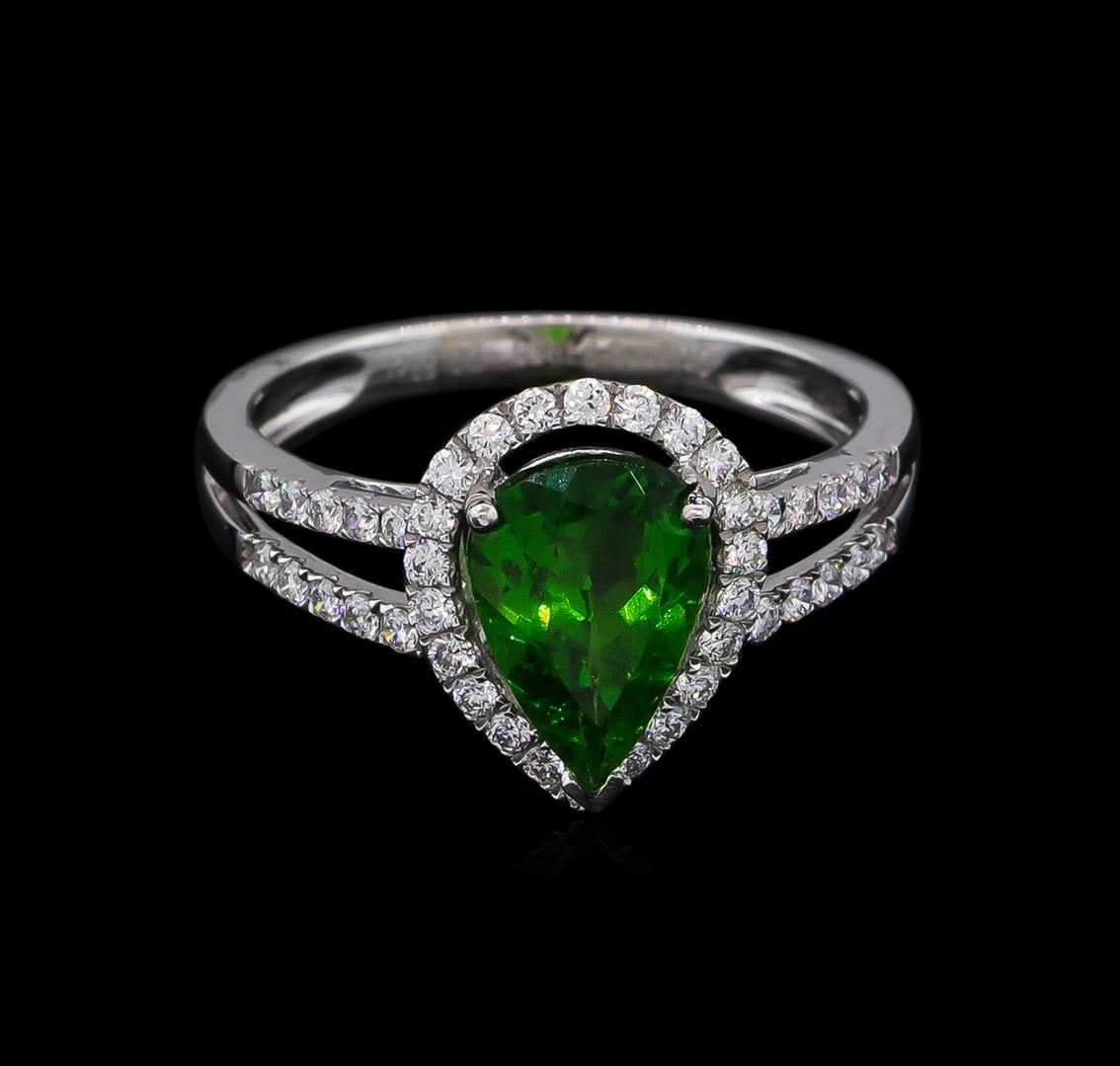 One electronically tested platinum lady's cast fashion ring with a split shank halo with a bright polish finish. The featured lady's ring has a shank measuring 2.36 millimeters wide. Trademark is Orianne. Identified with markings of "PT 950". Condition is new, good workmanship. Containing: One prong set pear modified brilliant cut natural tsavorite garnet, measuring 9.95 x 6.87 x 4.27mm, approximate weight of 1.90ct., clarity is slightly included, type II, medium dark, strong, green color, (GIA G 6/5), cut is good. Transmitting light with a minimum of distortion, transparent. Colored gemstones are presumed to have been subjected to commonly used enhancement processes. Graded in the setting. Forty-Two prong set round brilliant cut diamonds, measuring 1.40 - 1.30 x 0.84mm (depth est.) approximate total weight of 42 Stones = 0.39ct. Graded in the setting. Clarity: VS-2 to SI-1. Color: H - I. Cut Very Good. Total Weight of Colored Stones 1.90ct. Total Weight of Diamonds 0.39ct. Total Weight of Ring 4.50gm. GAS Appraised at $7,880.00.