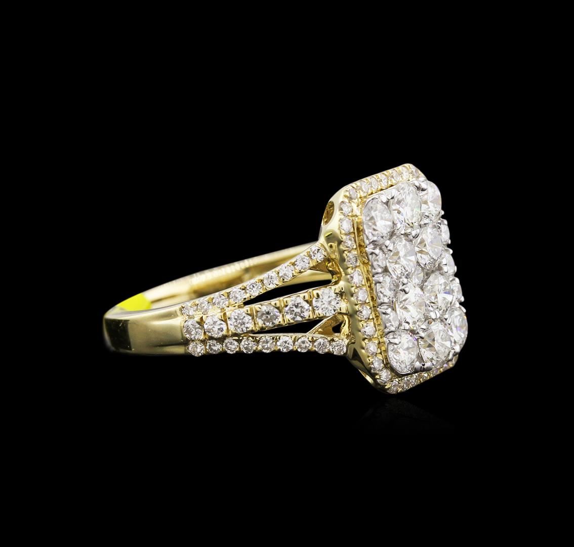 One electronically tested 14KT yellow gold lady's cast fashion ring with a split shank with a bright polish finish. Condition is new. Identified with markings of "14K". Containing: Eighteen prong set round brilliant cut diamonds, measuring 1.80 - 1.70 x 1.05mm (depth est.) approximate total weight of 18 Stones = 0.35ct. Graded in the setting. Clarity: SI-2 to I-1. Color: H - I. Cut: Good. Ten prong set round brilliant cut diamonds, measuring 3.30 - 3.25 x 1.97mm (depth est.) approximate total weight of 10 Stones = 1.30ct. Graded in the setting. Clarity: SI-2 to I-1. Color: G - I. Cut: Good. Seventy-two prong set round brilliant cut diamonds, measuring 1.00 - 0.95 x 0.59mm (depth est.) approximate total weight of 72 Stones = 0.25ct. Graded in the setting. Clarity: SI-2 to I-1. Color: H - J. Cut: Good. Total Weight of Diamonds: 1.90ct. Total Weight of Ring: 4.00 gm. GAS Appraised at $7,670.00.
