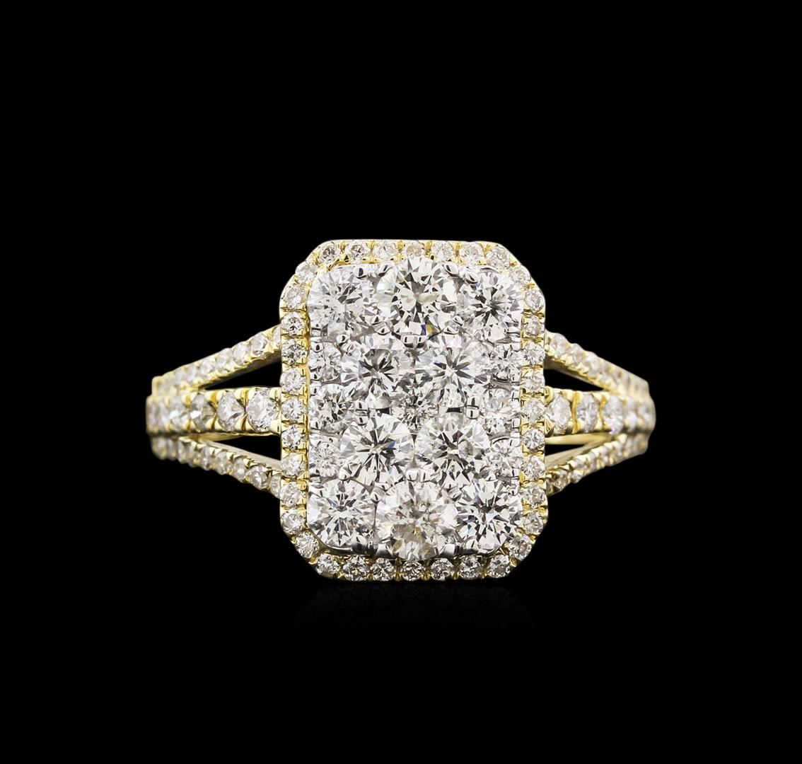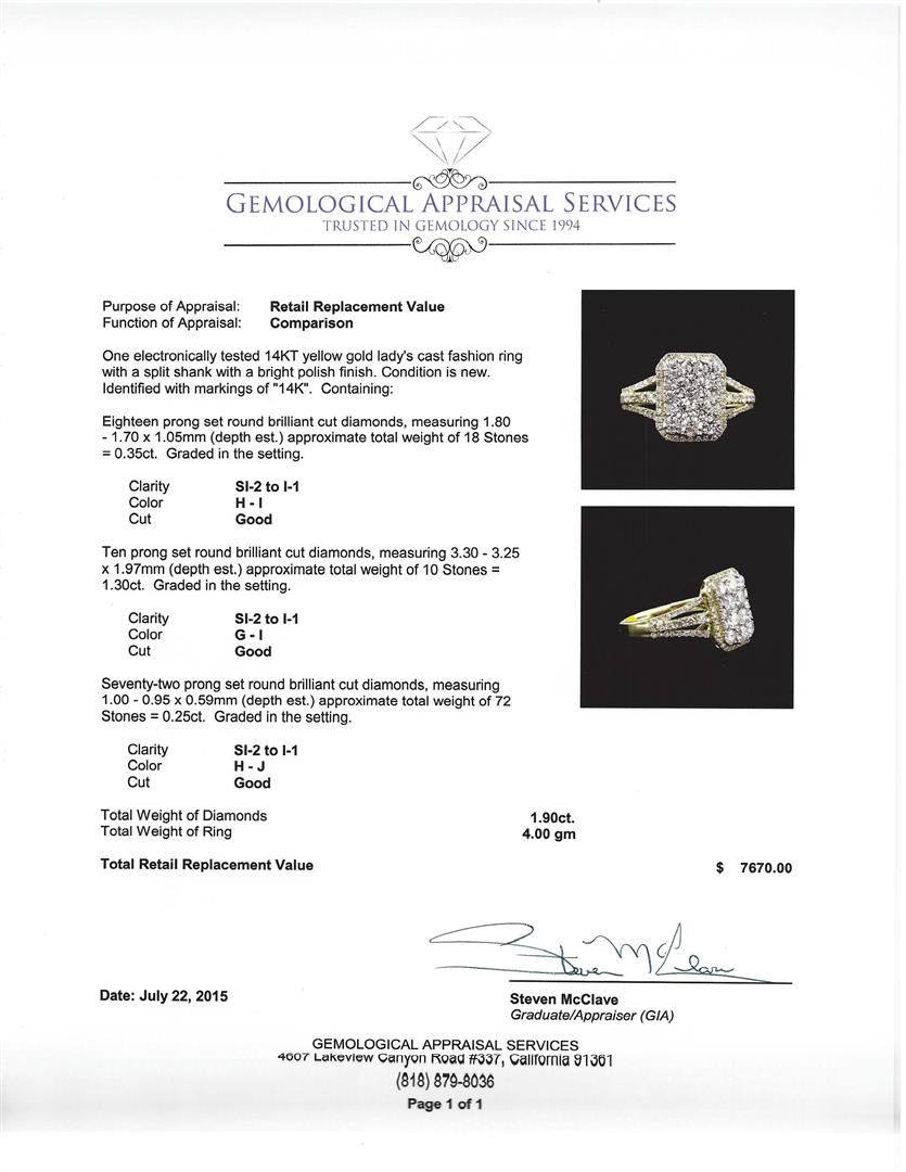 One electronically tested 14KT yellow gold lady's cast fashion ring with a split shank with a bright polish finish. Condition is new. Identified with markings of "14K". Containing: Eighteen prong set round brilliant cut diamonds, measuring 1.80 - 1.70 x 1.05mm (depth est.) approximate total weight of 18 Stones = 0.35ct. Graded in the setting. Clarity: SI-2 to I-1. Color: H - I. Cut: Good. Ten prong set round brilliant cut diamonds, measuring 3.30 - 3.25 x 1.97mm (depth est.) approximate total weight of 10 Stones = 1.30ct. Graded in the setting. Clarity: SI-2 to I-1. Color: G - I. Cut: Good. Seventy-two prong set round brilliant cut diamonds, measuring 1.00 - 0.95 x 0.59mm (depth est.) approximate total weight of 72 Stones = 0.25ct. Graded in the setting. Clarity: SI-2 to I-1. Color: H - J. Cut: Good. Total Weight of Diamonds: 1.90ct. Total Weight of Ring: 4.00 gm. GAS Appraised at $7,670.00.