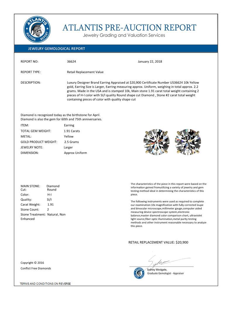 REF-285M2H -36624 ---- 1.91 CTW Certified H-SI/I Quality Diamond Solitaire Stud Earrings 10K Yellow Gold ---- Luxury Designer Brand Earring Appraised at $20,900 Certificate Number US36624 10k Yellow gold, Earring Size is Larger, Earring measuring approx. Uniform, weighing in total approx. 2.2 grams. Made in the USA and is stamped 10k, Main stone 1.91 carat total weight containing 2 pieces of H-I color with SI/I quality Round shape cut Diamond , Stone #2 carat total weight containing pieces of color with quality shape cut