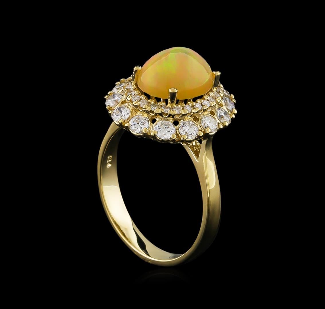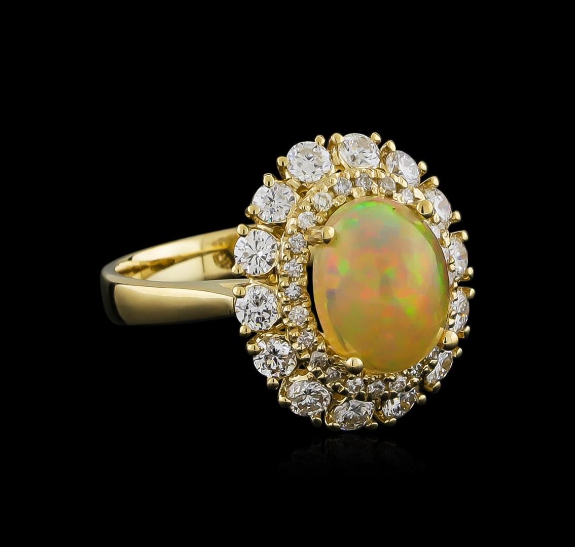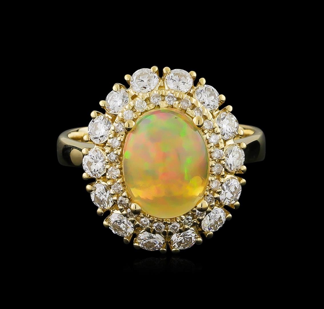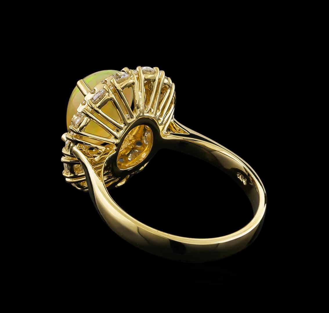 One electronically tested 14KT yellow gold lady's cast fashion ring with a double basket halo with a bright polish finish. The featured lady's ring has a shank measuring 2.97 millimeters wide. Identified with markings of "K14". Condition is new, good workmanship. Containing: One orange crystal that is cut in a oval shaped cabochon and is prong set, measuring 10.17 mm long x 8.11 mm wide, and 4.96 mm thick and the approximate weight is 1.91 carats. The opal has a somewhat bright, green-orange play of color (fire) in a rolling flashfire pattern; a medium dome; a good cut; no inclusions; consistent in its brightness and pattern; and is not directional. Graded in the setting. Fourteen prong set round brilliant cut diamonds, measuring 2.60 - 2.50 x 1.58mm (depth est.) approximate total weight of 14 Stones = 0.90ct. Graded in the setting. Clarity: SI-1 to I-1. Color: G - Good Twenty-Four prong set round brilliant cut diamonds, measuring 1.20 - 1.10 x 0.71mm (depth est.) approximate total weight of 24 Stones = 0.14ct. Graded in the setting. Clarity: SI-1 to I-1. Color: H - I. Cut Good. Total Weight of Diamonds 1.04ct. Total Weight of Opals 1.91ct. Total Weight of Ring 5.10gm. GAS Appraised at $3,810.00.