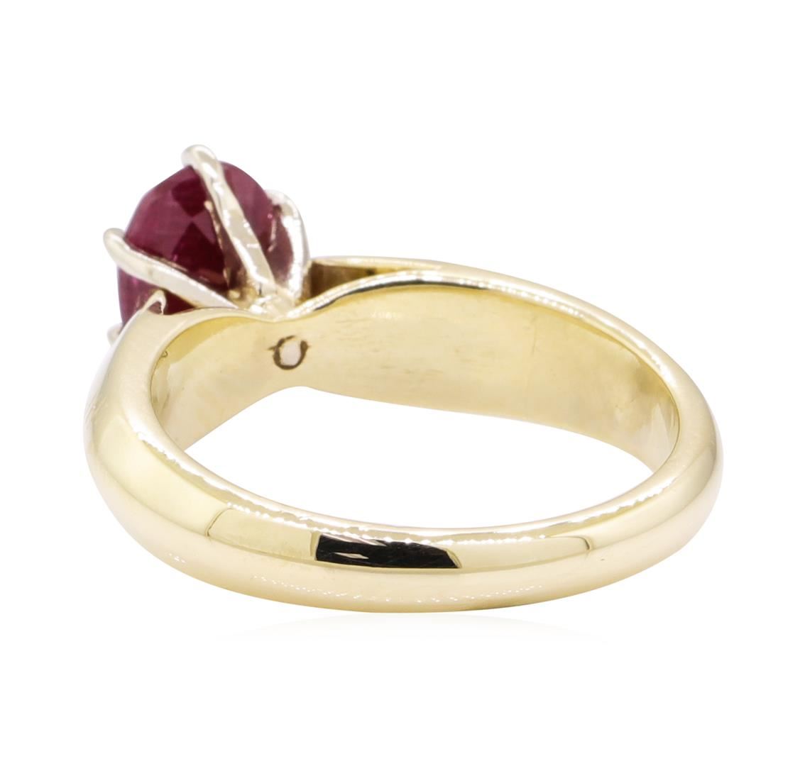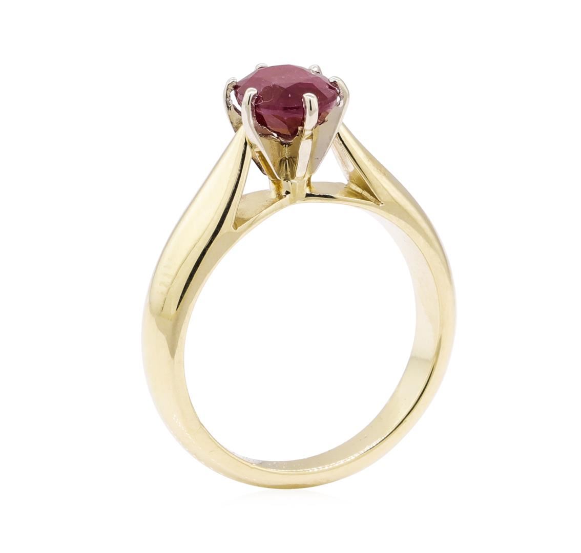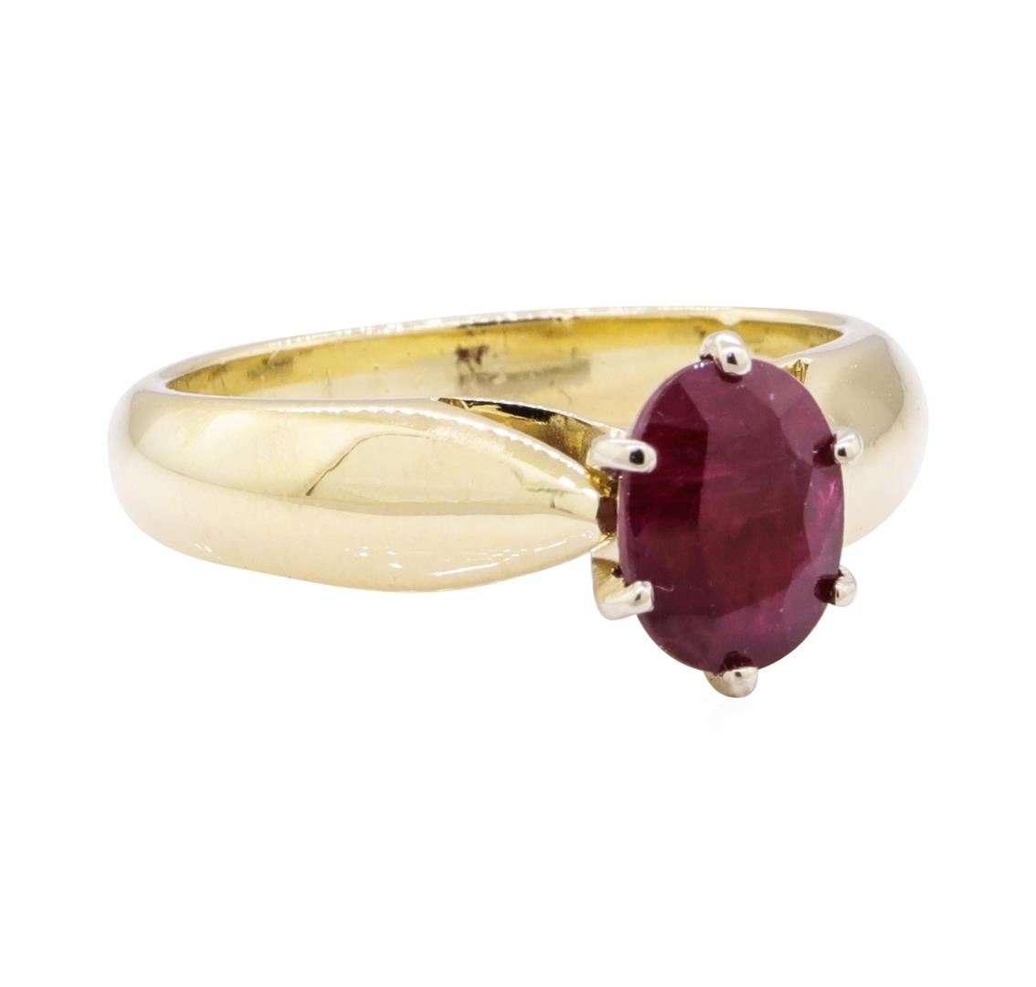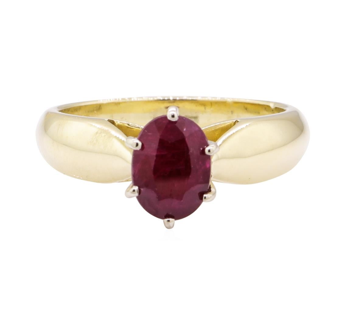 One ring featuring: 14KT yellow gold weighing 6.1 grams containing one oval cut ruby weighing 1.91ct. The ring has a pinched cathedral motif.