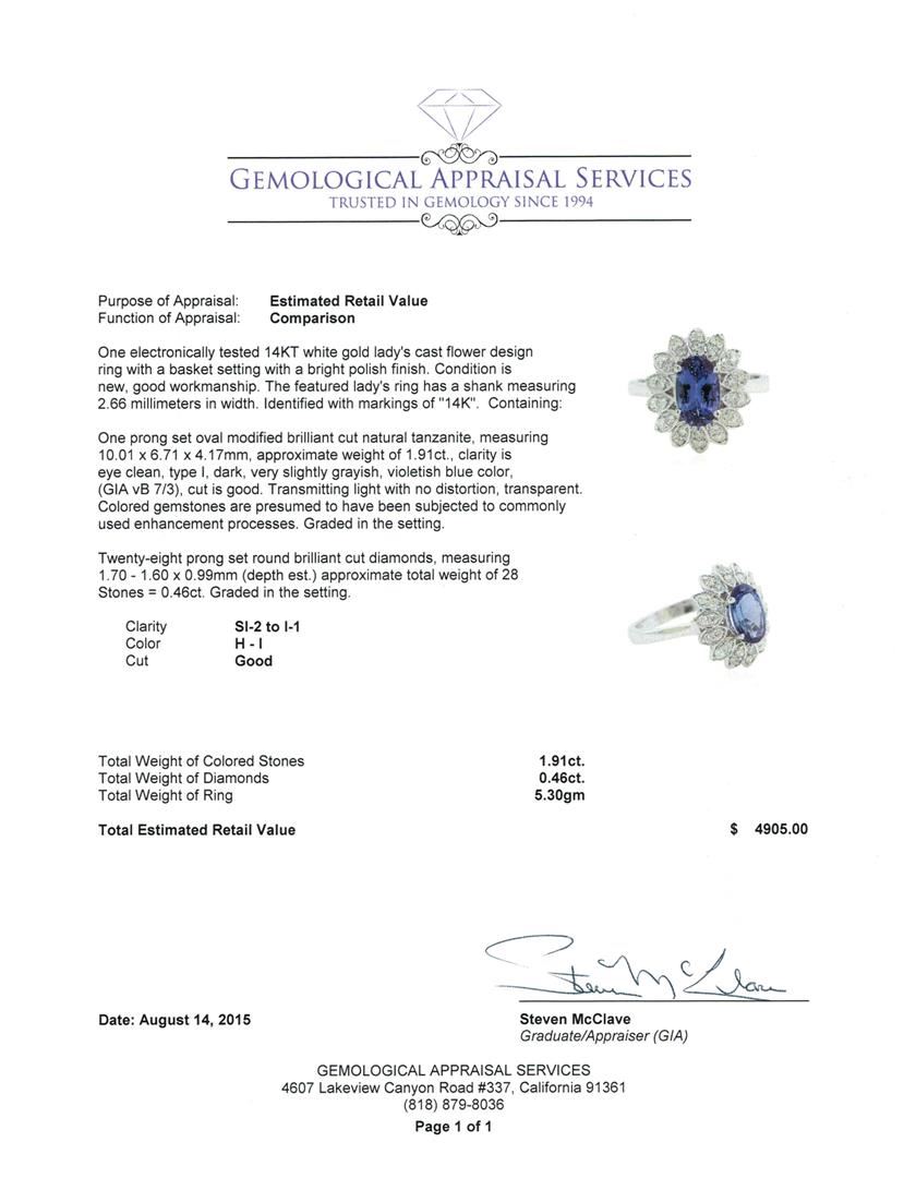 One electronically tested 14KT white gold lady's cast flower design ring with a basket setting with a bright polish finish. The featured lady's ring has a shank measuring 2.66 millimeters in width. Identified with markings of "14K". Condition is new, good workmanship. Containing: One prong set oval modified brilliant cut natural tanzanite, measuring 10.01 x 6.71 x 4.17mm, approximate weight of 1.91ct., clarity is eye clean, type I, dark, very slightly grayish, violetish blue color, (GIA vB 7/3), cut is good. Transmitting light with no distortion, transparent. Colored gemstones are presumed to have been subjected to commonly used enhancement processes. Graded in the setting. Twenty-Eight prong set round brilliant cut diamonds, measuring 1.70 - 1.60 x 0.99mm (depth est.) approximate total weight of 28 Stones = 0.46ct. Graded in the setting. Clarity: SI-2 to I-1. Color: H - I. Cut Good. Total Weight of Colored Stones 1.91ct. Total Weight of Diamonds 0.46ct. Total Weight of Ring 5.30gm. GAS Appraised at $4,905.00.