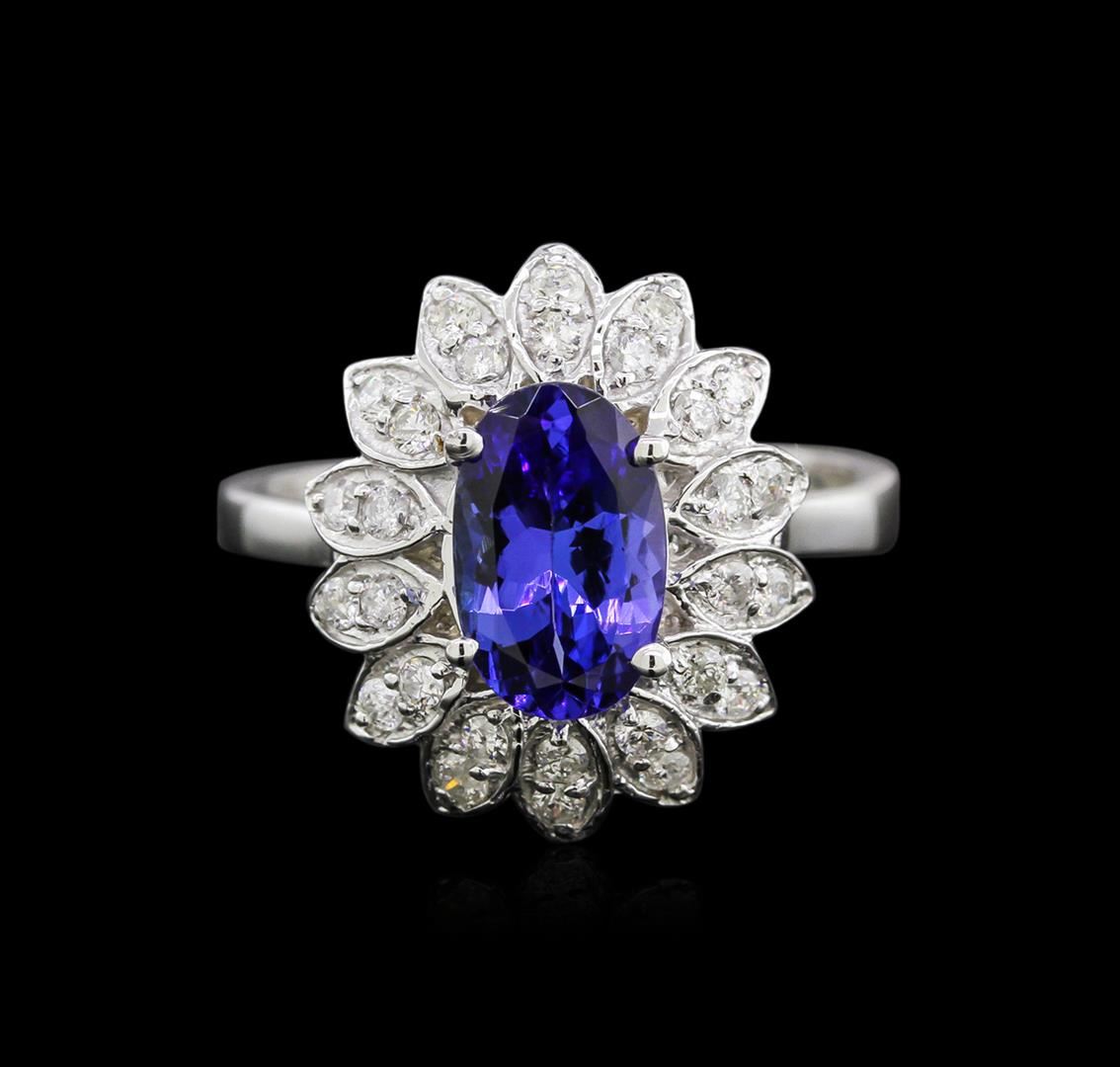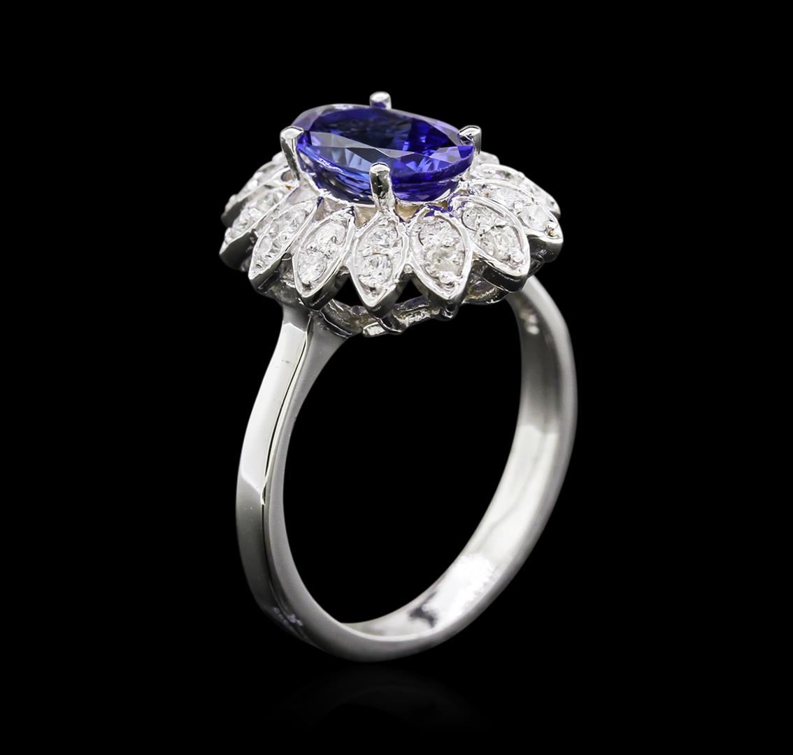One electronically tested 14KT white gold lady's cast flower design ring with a basket setting with a bright polish finish. The featured lady's ring has a shank measuring 2.66 millimeters in width. Identified with markings of "14K". Condition is new, good workmanship. Containing: One prong set oval modified brilliant cut natural tanzanite, measuring 10.01 x 6.71 x 4.17mm, approximate weight of 1.91ct., clarity is eye clean, type I, dark, very slightly grayish, violetish blue color, (GIA vB 7/3), cut is good. Transmitting light with no distortion, transparent. Colored gemstones are presumed to have been subjected to commonly used enhancement processes. Graded in the setting. Twenty-Eight prong set round brilliant cut diamonds, measuring 1.70 - 1.60 x 0.99mm (depth est.) approximate total weight of 28 Stones = 0.46ct. Graded in the setting. Clarity: SI-2 to I-1. Color: H - I. Cut Good. Total Weight of Colored Stones 1.91ct. Total Weight of Diamonds 0.46ct. Total Weight of Ring 5.30gm. GAS Appraised at $4,905.00.
