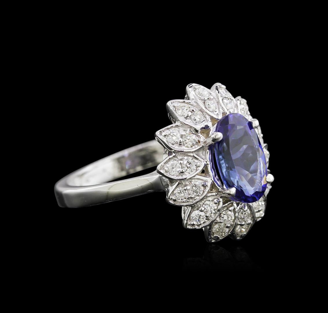 One electronically tested 14KT white gold lady's cast flower design ring with a basket setting with a bright polish finish. The featured lady's ring has a shank measuring 2.66 millimeters in width. Identified with markings of "14K". Condition is new, good workmanship. Containing: One prong set oval modified brilliant cut natural tanzanite, measuring 10.01 x 6.71 x 4.17mm, approximate weight of 1.91ct., clarity is eye clean, type I, dark, very slightly grayish, violetish blue color, (GIA vB 7/3), cut is good. Transmitting light with no distortion, transparent. Colored gemstones are presumed to have been subjected to commonly used enhancement processes. Graded in the setting. Twenty-Eight prong set round brilliant cut diamonds, measuring 1.70 - 1.60 x 0.99mm (depth est.) approximate total weight of 28 Stones = 0.46ct. Graded in the setting. Clarity: SI-2 to I-1. Color: H - I. Cut Good. Total Weight of Colored Stones 1.91ct. Total Weight of Diamonds 0.46ct. Total Weight of Ring 5.30gm. GAS Appraised at $4,905.00.